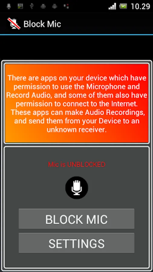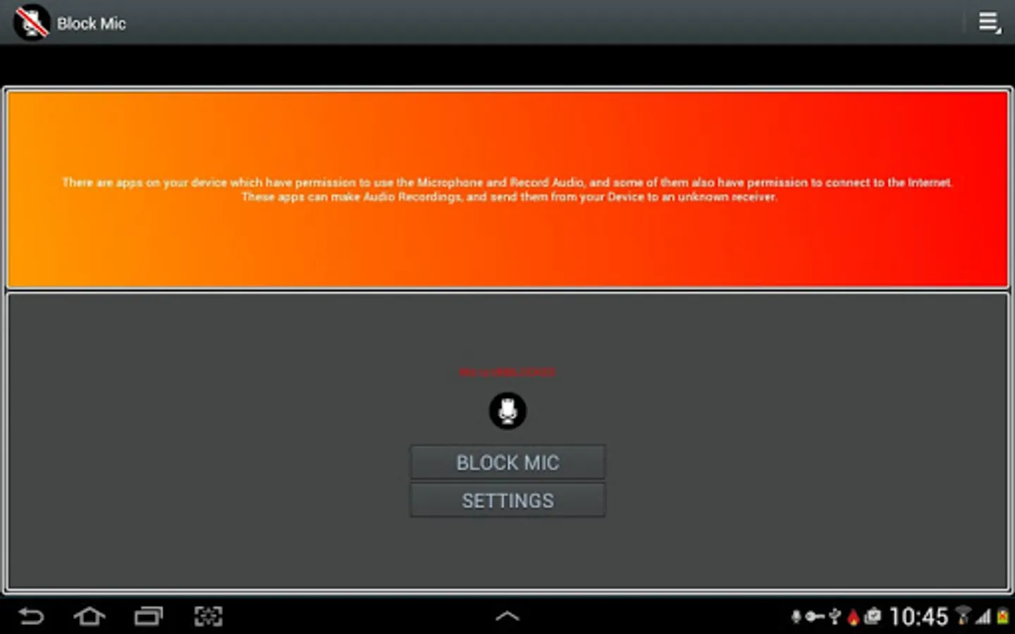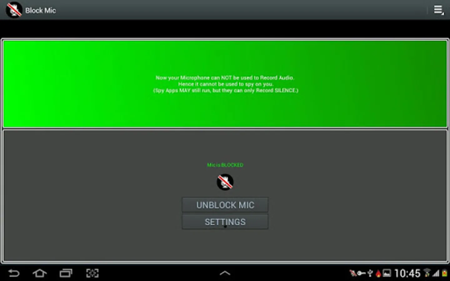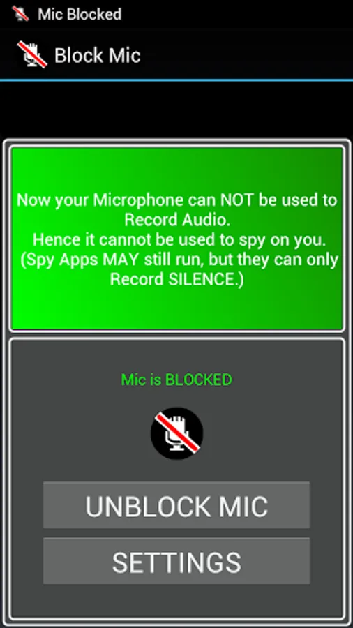 This App - “Block Microphone” - will protect you from being spied on in this way, by enabling you to BLOCK THE MICROPHONE on your device at any time you choose. Before you want to make a Recording yourself, simply touch a button to UNBLOCK the Microphone.