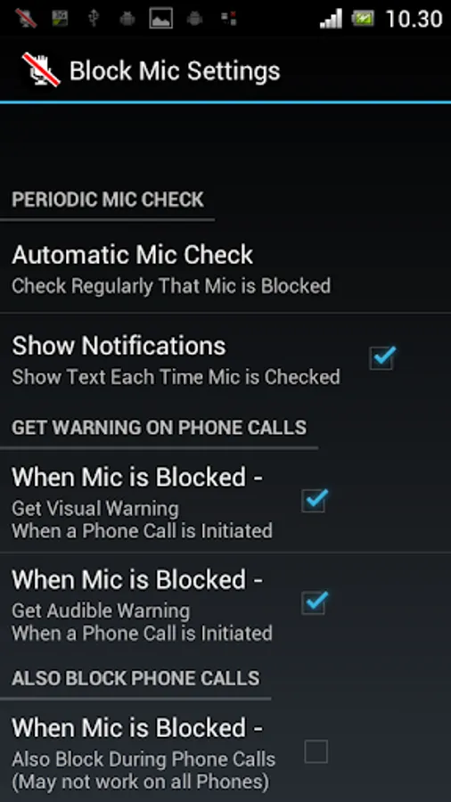 The Microphone is automatically UnBlocked before you start a normal Outgoing or Incoming Phone Call, and Blocked again after the Call is finished. (Due to technical issues on most Android Phones, it is not possible to mute the Microphone during Phone Calls.)