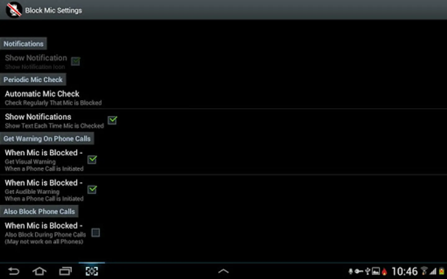 The main purpose of this app is to block the Mic so that no one can make recordings of your surroundings (and send the recorded file to some unknown receiver.)