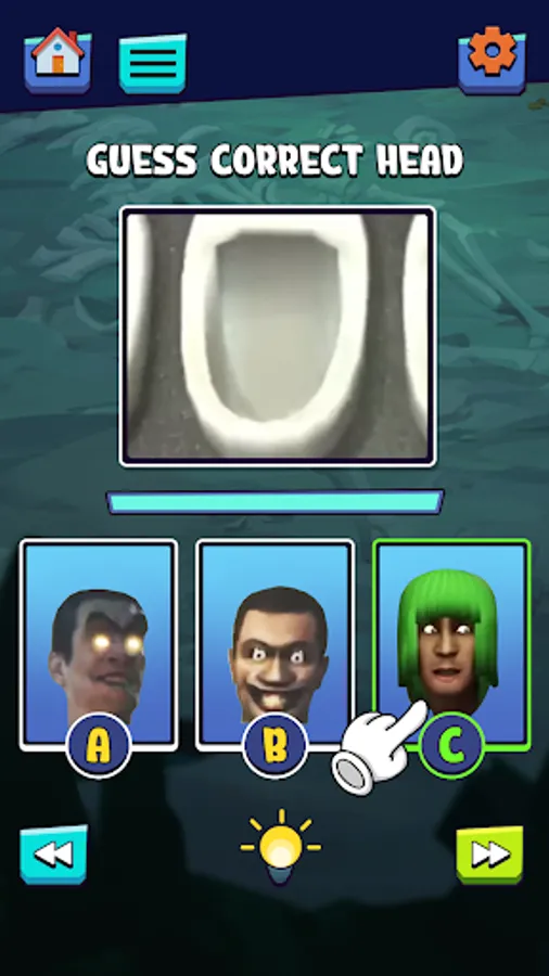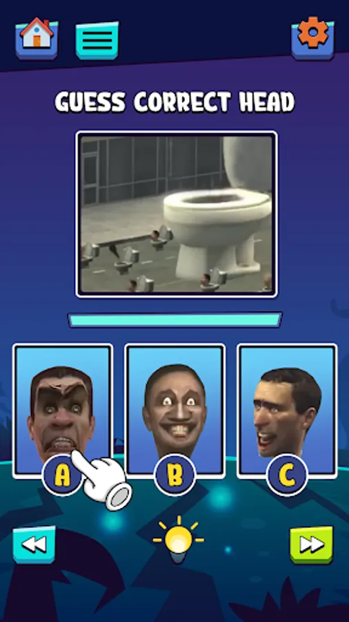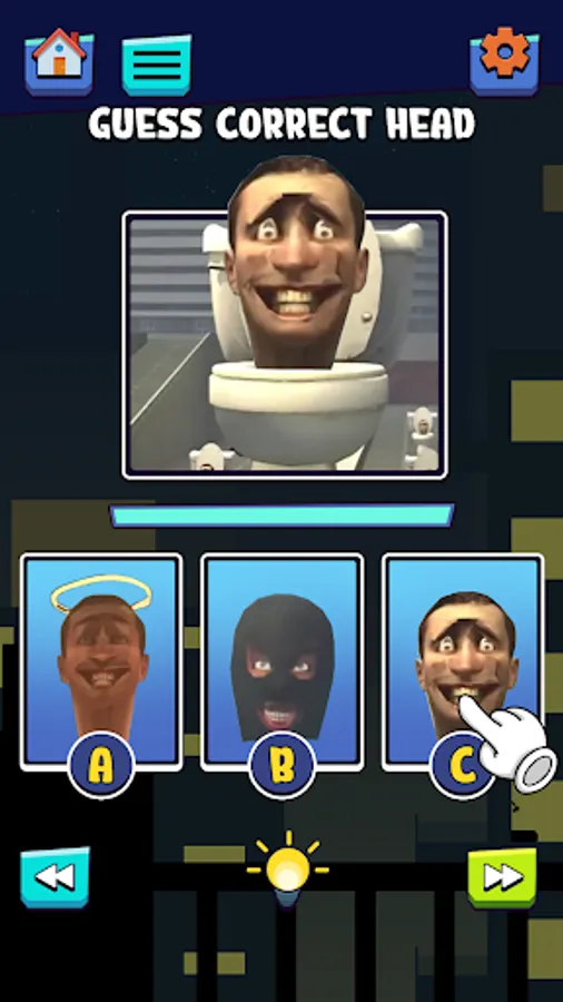 - Choose the correct head, mouth, or eyes of Ski Toilet monster among the following picture A, B, or C.