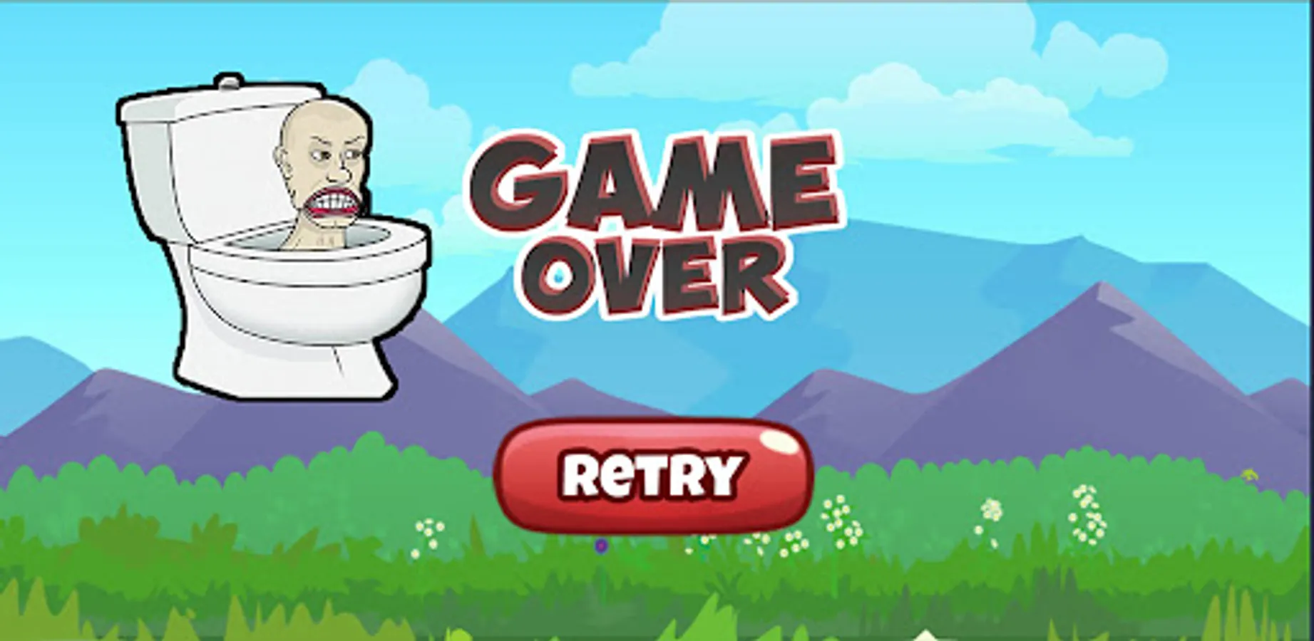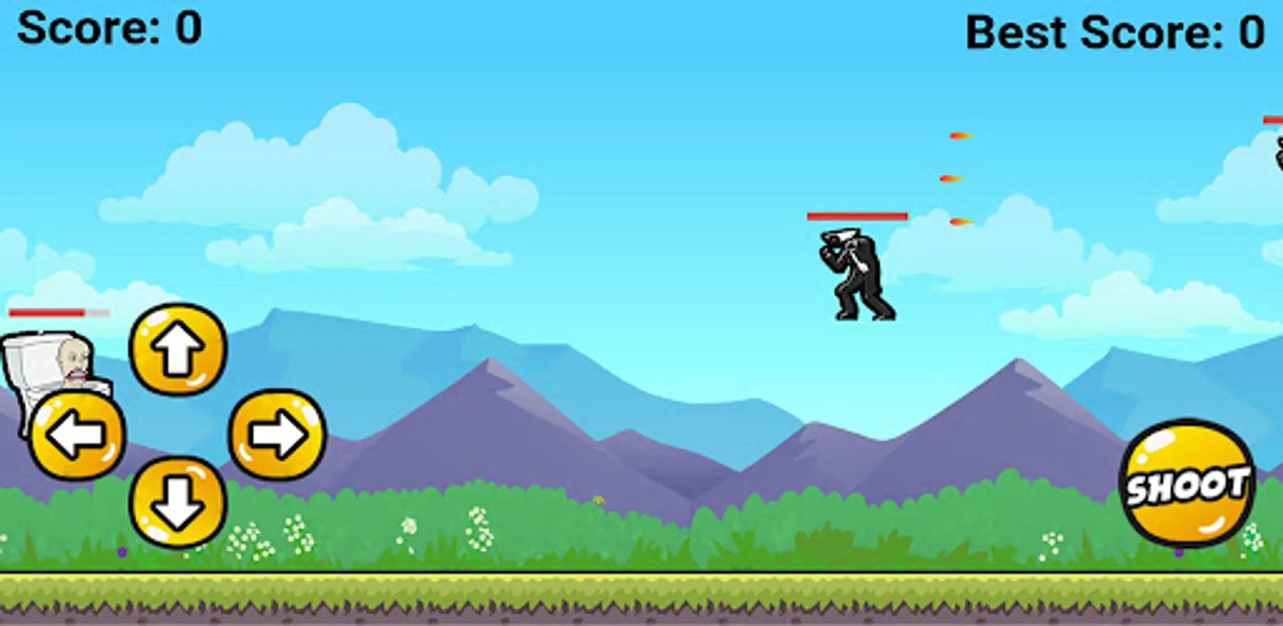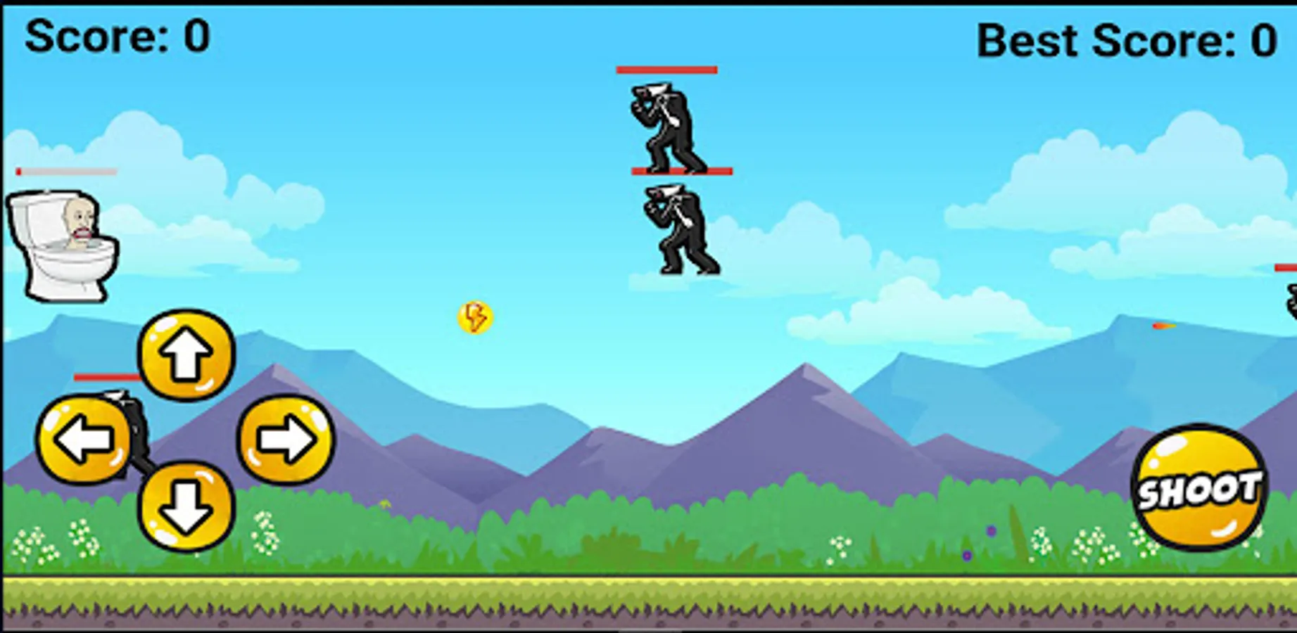 this is an adventure game you can jump and push a fire from the toilet into a cameraman and an alien and collect scores, you can jump and fly with the character of skibidi it's a really funny thing that you can play with a toilet skybidi and fight all cameraman who wants catch and destroy ski bidi from earth