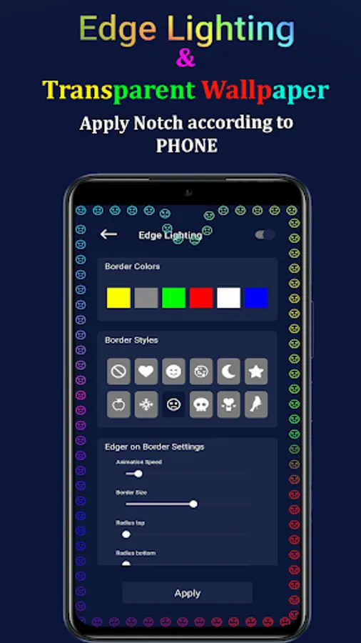 Edge Lighting wallpaper also has the feature to curve the border lights according to your phone and the need of your device. A notch light setting is also available in the display light where you can notch the lights according to your device's needs. Wallpaper borders is a very cool app with low battery consumption and work as battery saver wallpaper. The screen light wallpaper is a live wallpaper that shows light wallpaper across the border of your mobile where you can customize and change the shape of the edge light wallpaper.