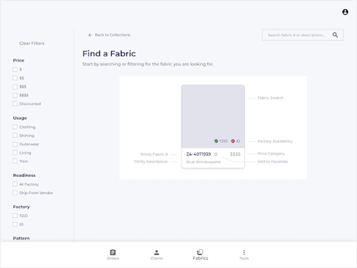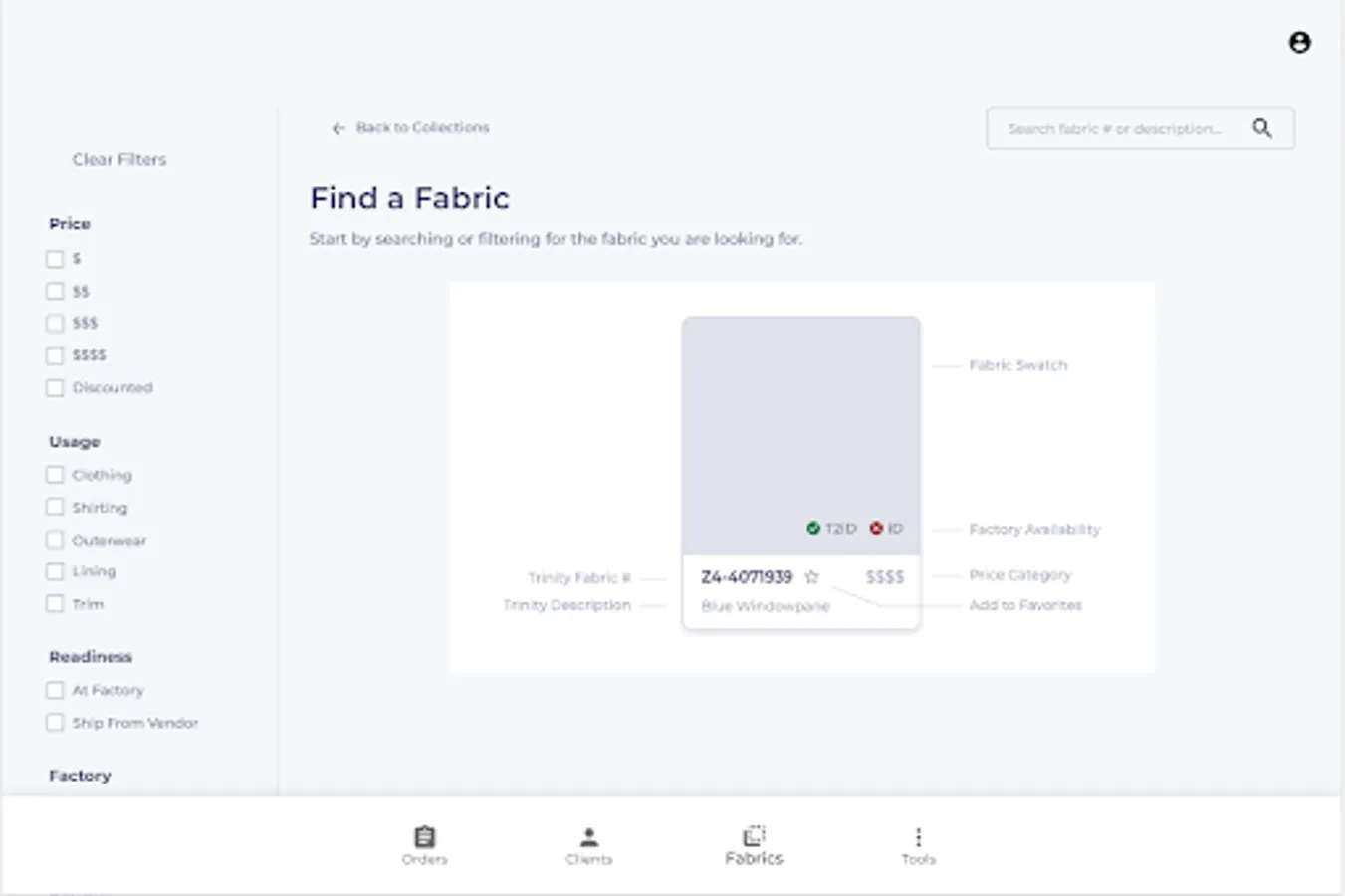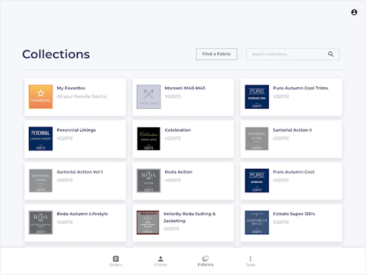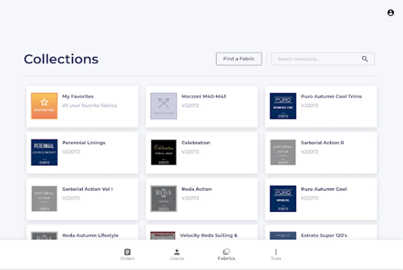 Our Fabrics section allows you to effortlessly review fabric availability at different production facilities and get more information about the chosen material. Whether searching for a collection, specific fabric or scanning the QR code on the back of a physical folder – we've got you covered! Plus, instantly discover what any fabric looks like when made up in its corresponding garment types - all right here!