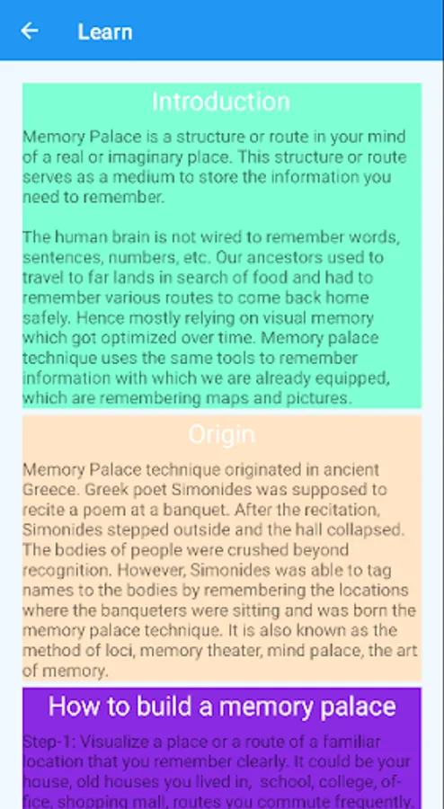 Memory Palace is a structure or route in your mind of a real or imaginary place. This structure or route serves as a medium to store the information you need to remember.