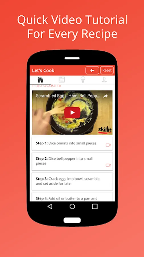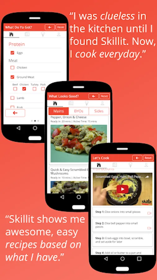 We did this by asking a simple, yet often overlooked, question: what’s in your kitchen right now that you want to cook with? Tell us what you got – say, chicken, eggs, rice, and broccoli – and we’ll show what you can make. Once you decide what you want to cook, we’ll walk you through every part of the cooking process. Need help dicing that onion? Just tap on the step and up pops a video showing you how to cut like a pro. Not sure why your chicken always turns out a little dry? Tips to elevate your cooking are just a tap away. Want to see different spice combinations to keep things fresh in the kitchen? Oh boy, do we got options for ya. At Skillit, we hate doing dishes, so we designed our reicpes to use as few dishes as possible - in fact, many of our reicpes just use one pan, trary, or skillet.