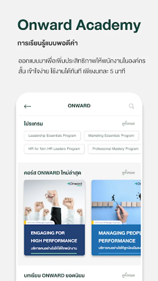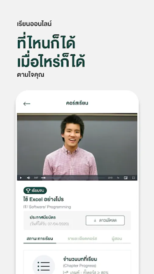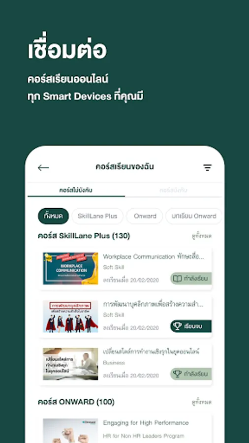 Thailand's number one online learning application for organizations is in your hands. Will continuously help your personnel develop their potential to stay ahead of the digital age Regardless of where, whenever, can learn Through more than 400 online courses taught by experts and more than 100 leading institutions. Packed in a variety of knowledge such as development of ideas and personality. Increase leadership skills Foreign language Computer programs and many more