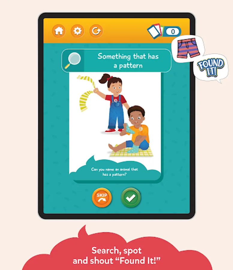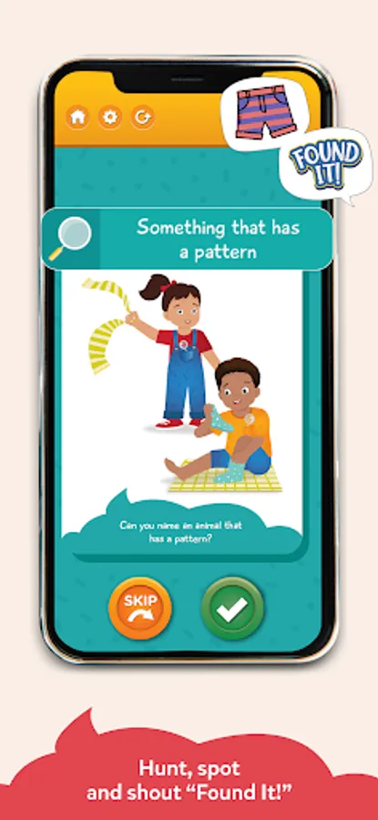 SCAVENGER HUNT - Found it! is an exciting game that helps children learn as they go on the most exciting ‘Search & Find’ with prompts like Can you find "Something with a pattern?", "Something smaller than your palm?” etc. Players must shout "FOUND IT!" as soon as they get their hands on the object!