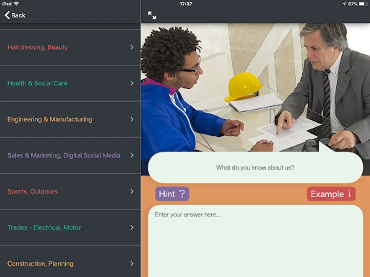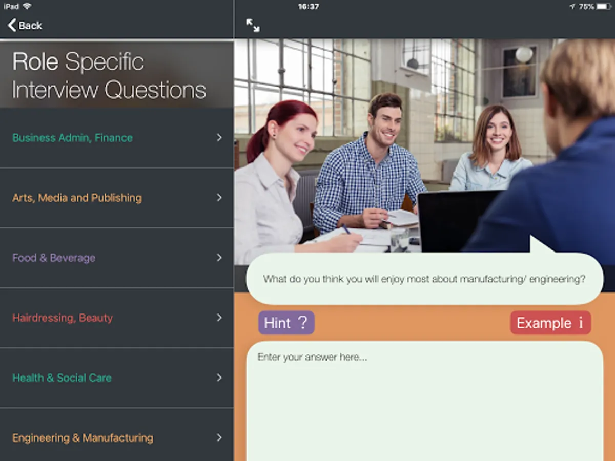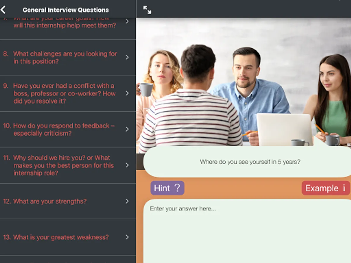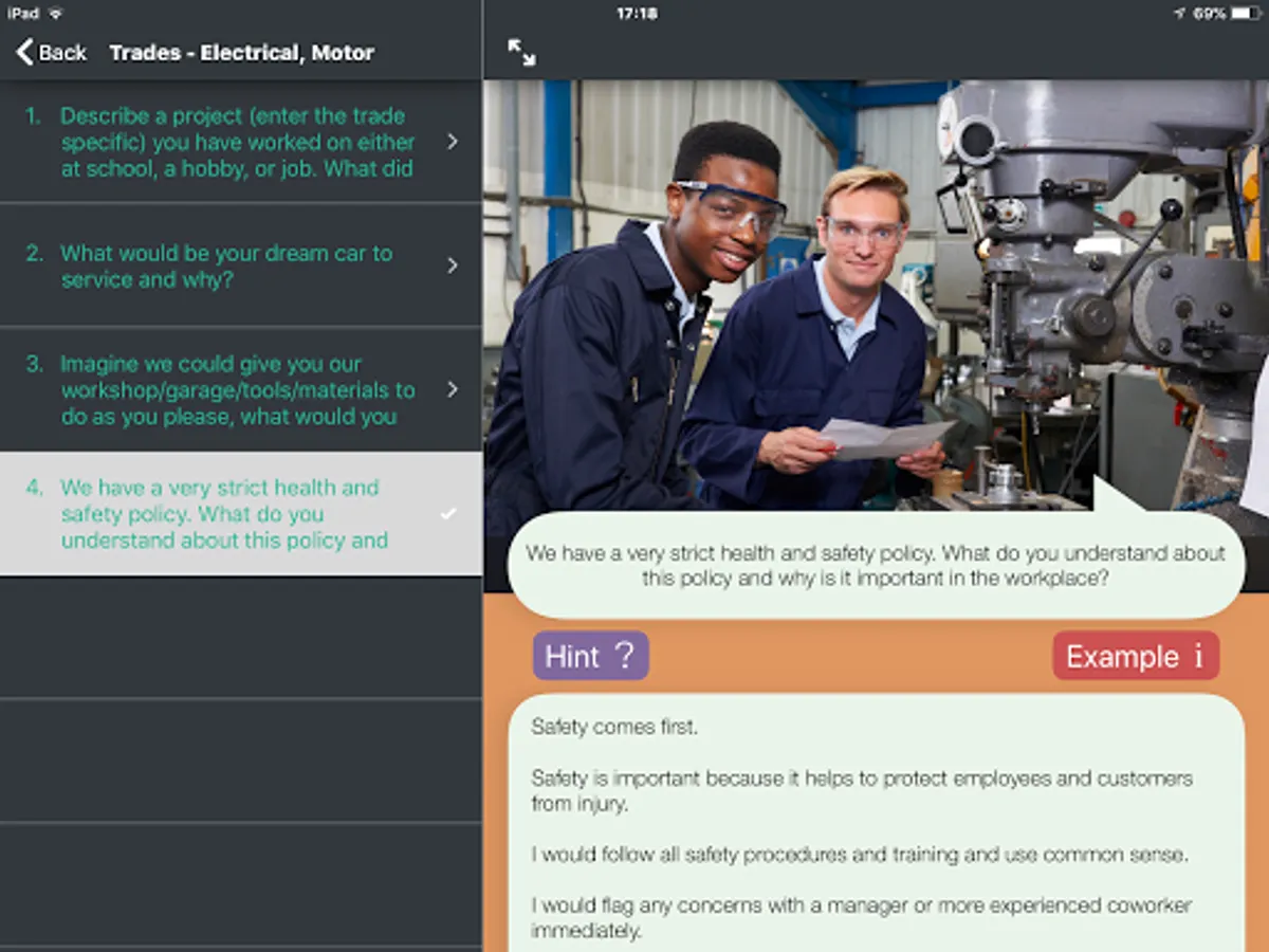 The app is designed to build confidence by explaining why why they are asking the questions, what they are looking for and what a good answer looks like.