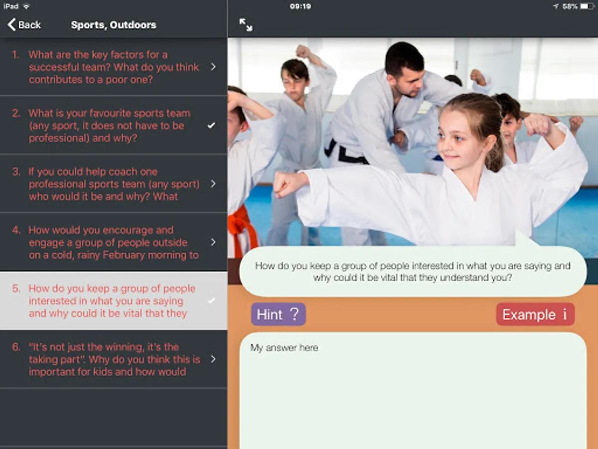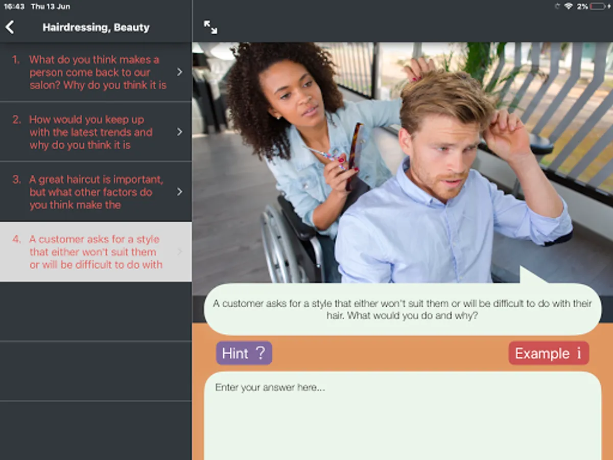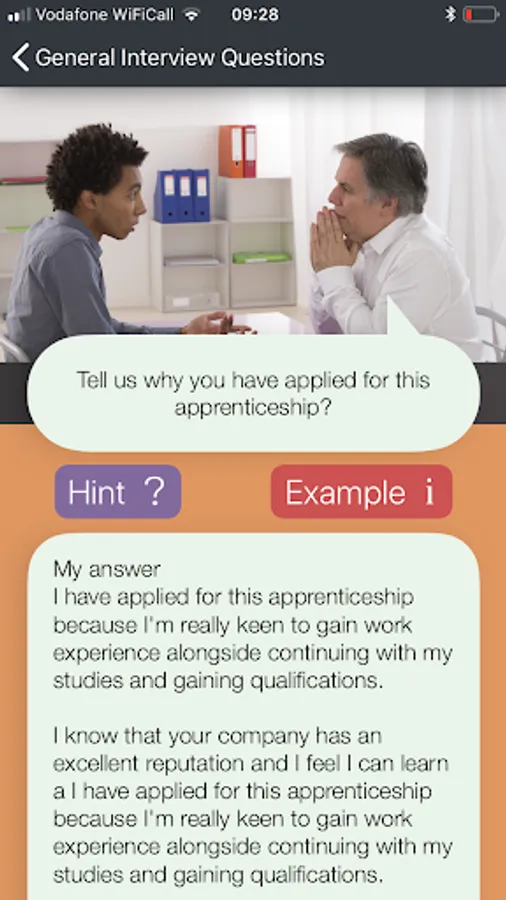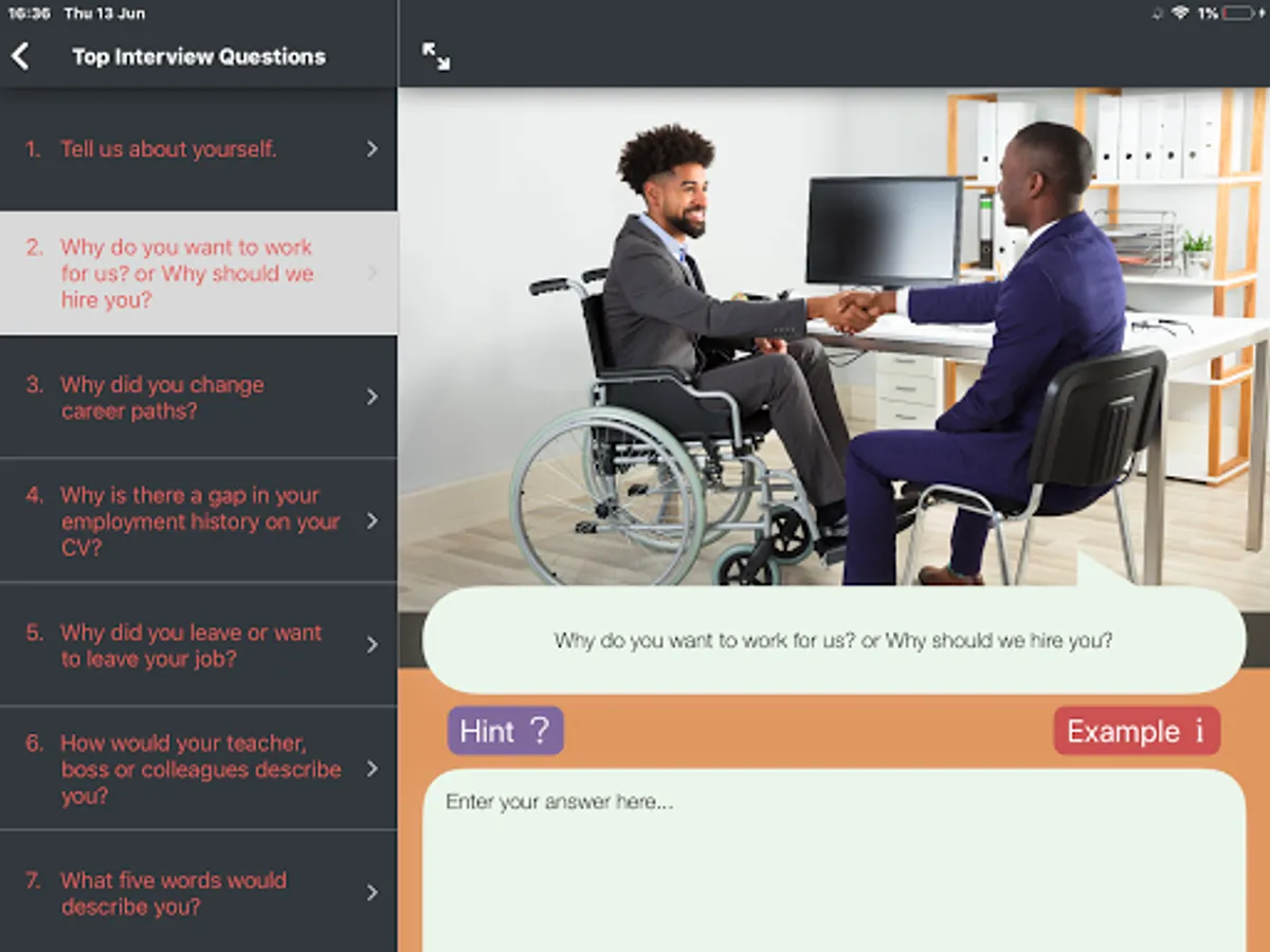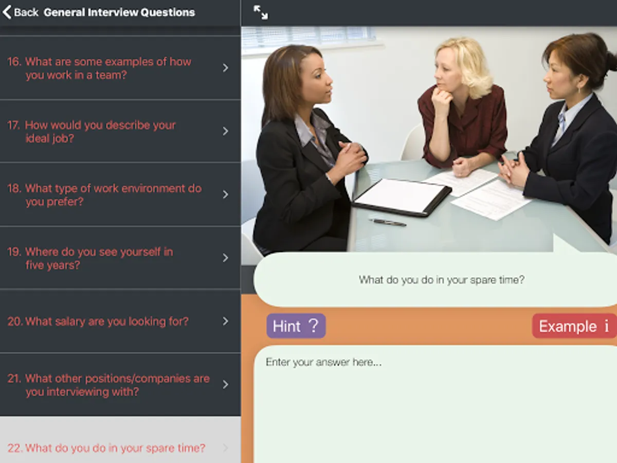The app is designed to build confidence by explaining why why they are asking the questions, what they are looking for and what a good answer looks like.