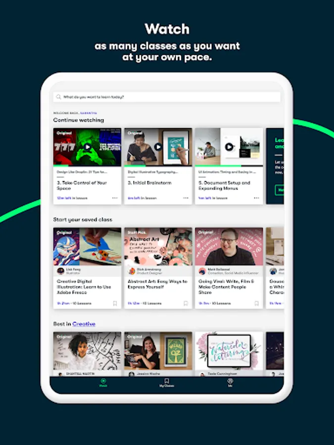Discover thousands of inspiring classes on topics like drawing, calligraphy, graphic design, photography, animation, arts and crafts, illustration, hand lettering, pattern design, icon design, watercolour, and more. Learn to use creative tools like Procreate, Fresco, Illustrator, and Photoshop.