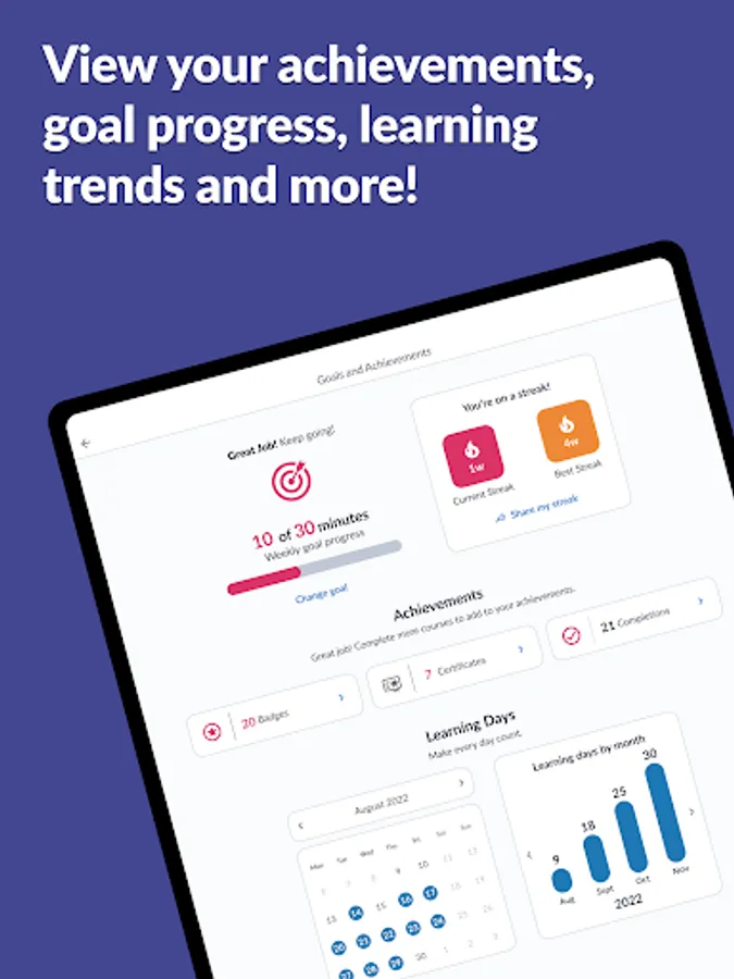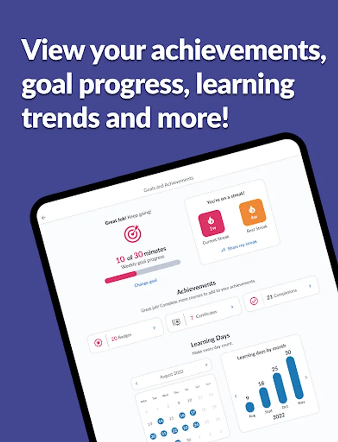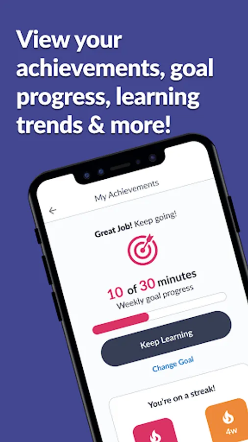 - SET A GOAL: Set a weekly learning goal and get reminded along the way to earn a streak.