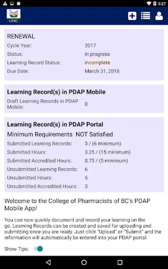 The College of Pharmacists of British Columbia created PDAP Mobile to provide pharmacists and pharmacy technicians with an accessible and convenient application where they can create, edit and submit their CE-Plus requirements to the College on a mobile device. More resources are available at www.bcpharmacists.org/pdapmobile.