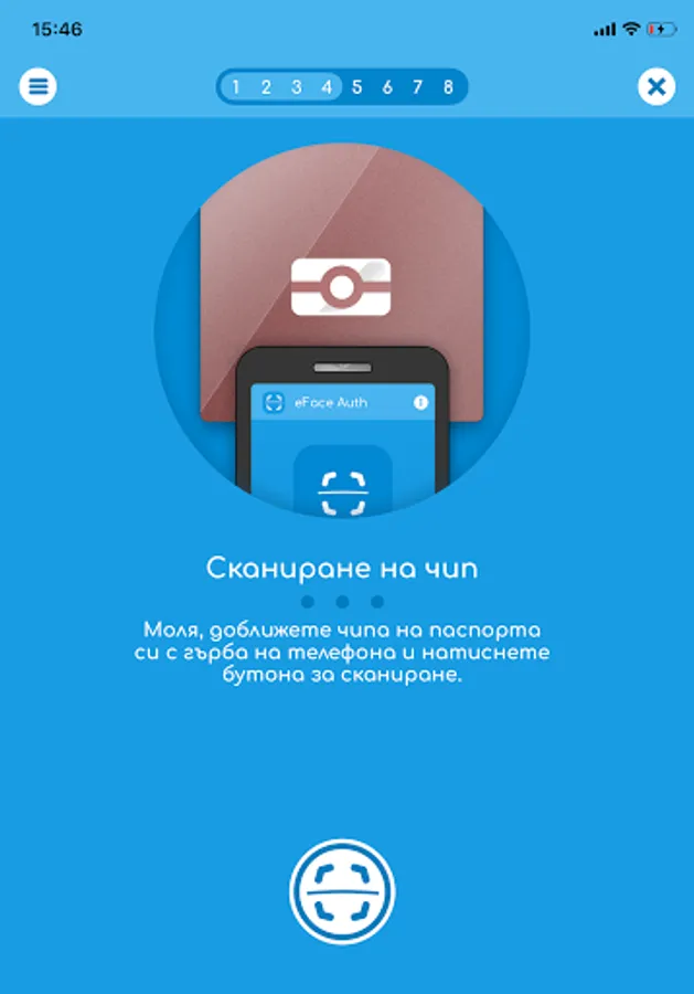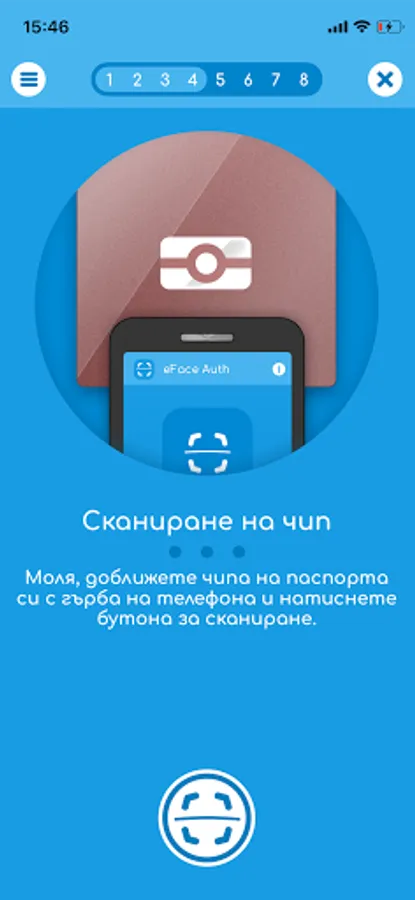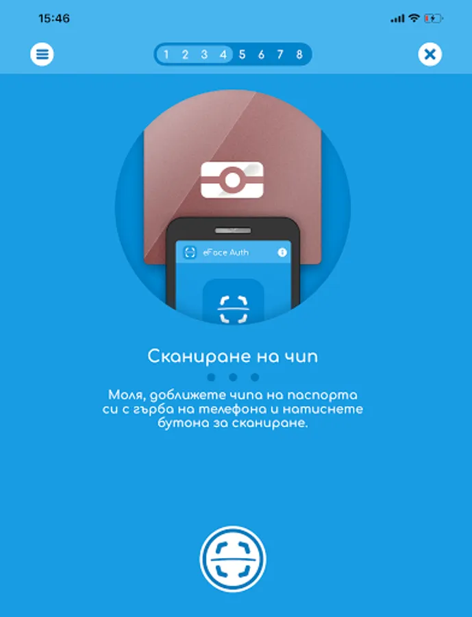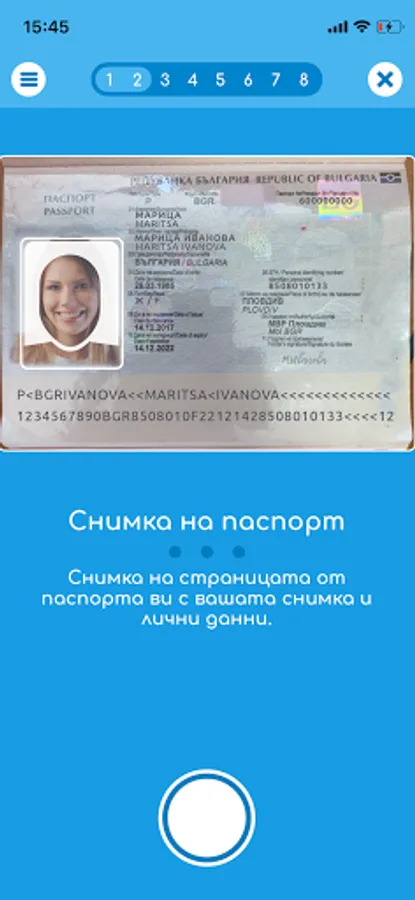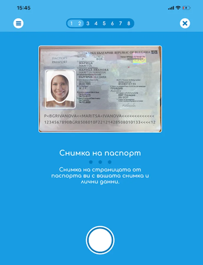 1. Capture the passport page containing the data for the holder of the document with the camera of the mobile device (smartphone), as well as machine reading of the passport data using the NFC reader of the smartphone.