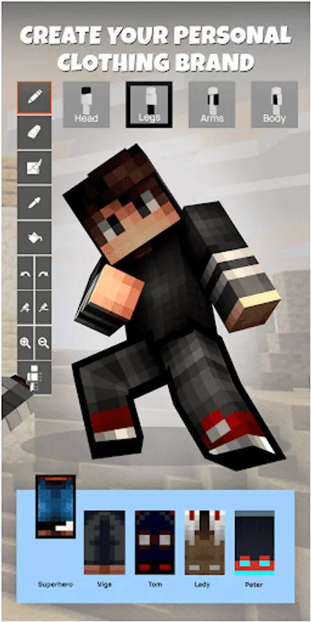 The skin maker allows you to turn your ideas into original character skins. Skin color, eyes, hair, hats, t-shirts and pants. Every time you get new youtuber skins, superhero skins, girls skins, boys in stylish jeans skins, camouflage skins, herobrine skins, mobs and many more.
