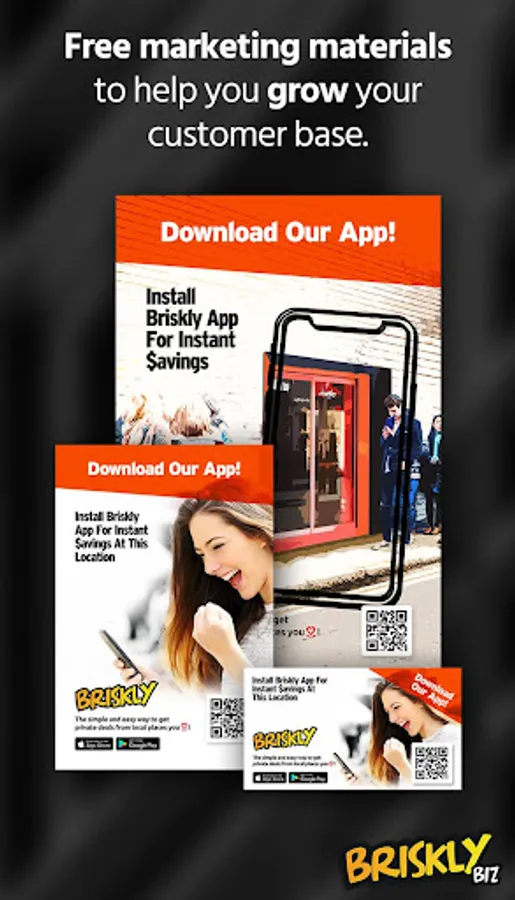 • Receive a free supply of marketing materials that includes posters, cards, and door stickers to post at your place of business. Customers can download the app to see deals with your own unique code.