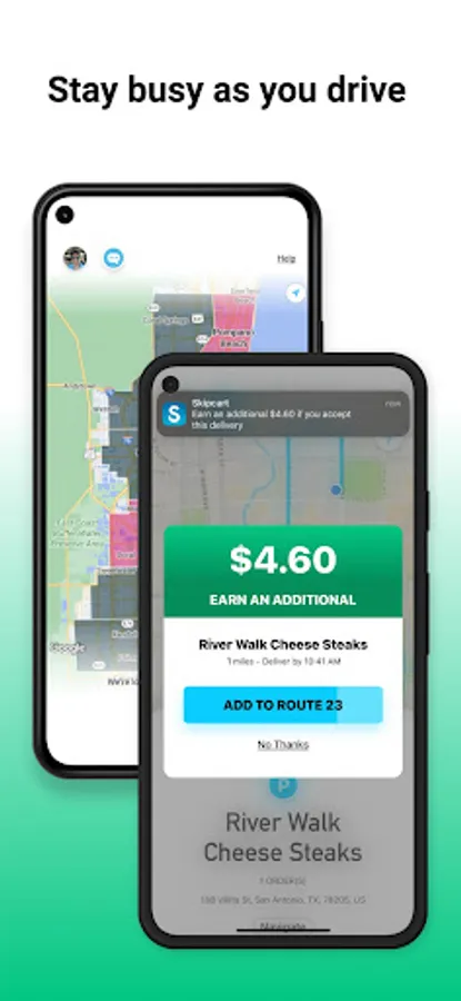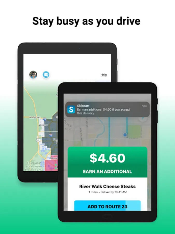 With Skipcart there are no time slots or hourly commitments. No debit cards, ordering for customers, or shopping. Our drivers go online when they want to pick up prepaid deliveries, drop them off to customers, and then go offline when they are done earning. That’s all there is to it.