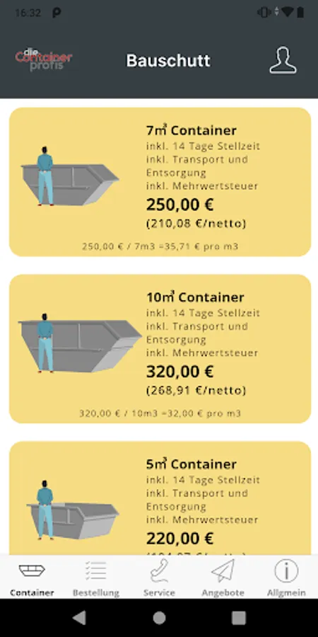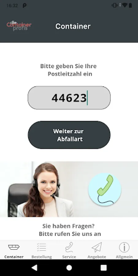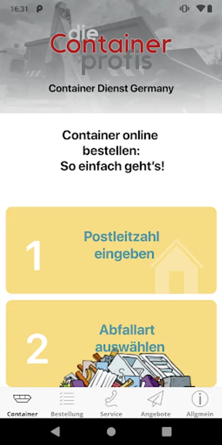 Enter your zip code and the content to be disposed of. You will then receive a selection of the available containers with the corresponding prices. Now enter the date for delivery and collection.