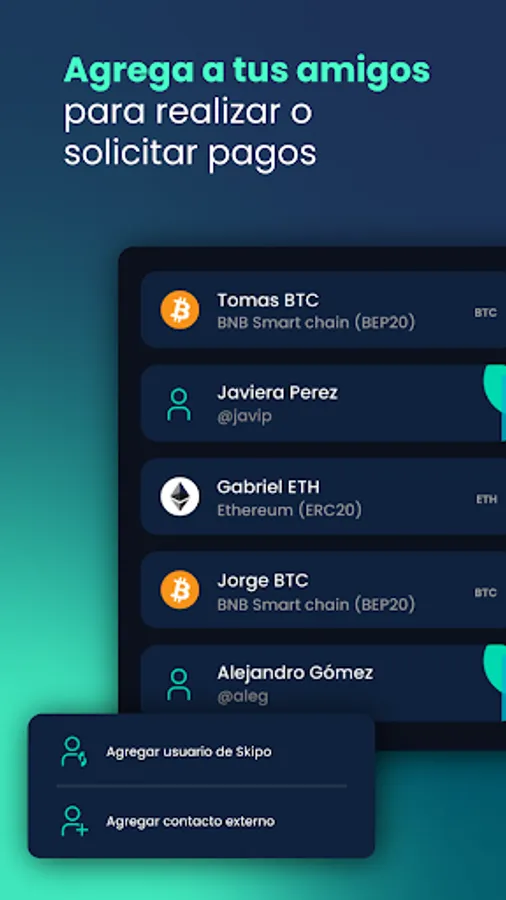 Import your cell phone contacts to easily add other Skipo users, to whom you can send crypto instantly and without commissions.