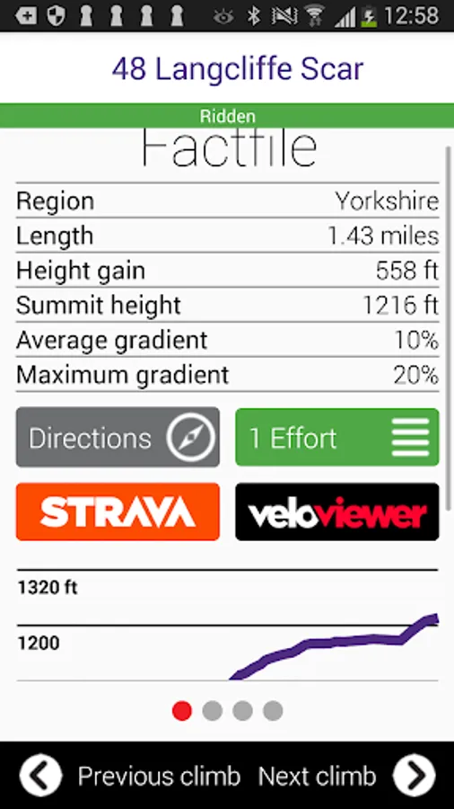 Exploring further you will see that via the interactive map you can locate and be instantly directed to the base of each climb and be taken to it’s factfile. In the factfile you will see the climb’s vital statistics together with comprehensive directions and a profile. Strava Subscribers will also see a link to your previous efforts and the ability to view it on Strava. Alternatively you can scroll the list which can be sorted by difficulty, geographically, by ridden, or best of all, by which is nearest to your current location. So no matter were you find yourself, if you have your bike and you can spare athe time you can head straight to the nearest climb on the list and bag it.