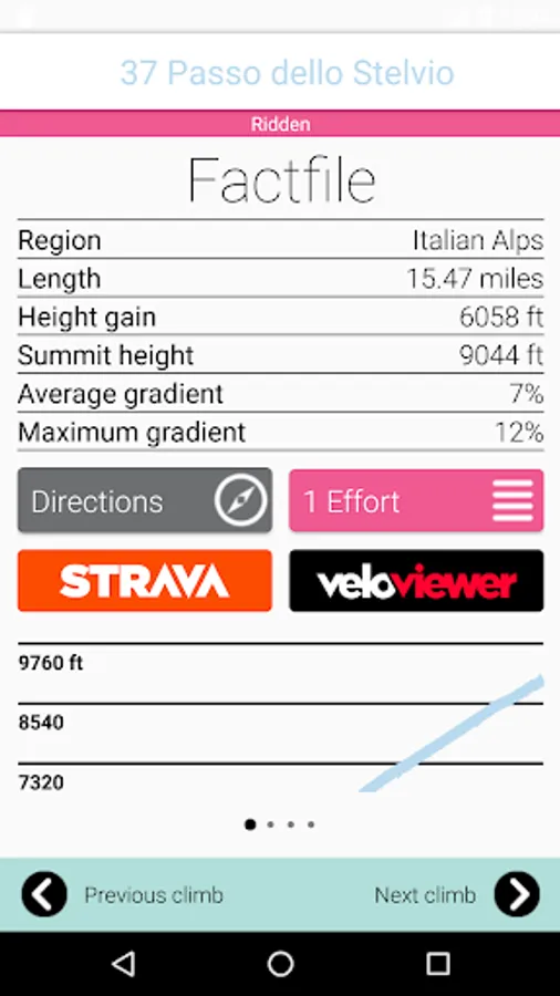 Via the interactive map you can locate and be instantly directed to the base of each climb and then be taken to it’s fact file where you will see its vital statistics, comprehensive directions and also links to view the segment on Strava and Veloviewer. Strava subscribers can quickly and simply check their efforts on each one, compare times over the years and see how you compare to the world’s best riders many of which hold the KOM and QOM on these iconic roads. From the home screen you can also scroll through the list of climbs which can be sorted by difficulty, geographically, by ridden, or best of all, by which is nearest to your current location.