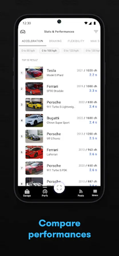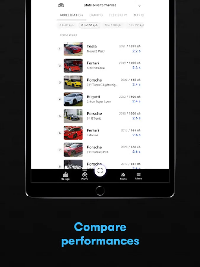 - Compare: display performances ranking of all vehicles