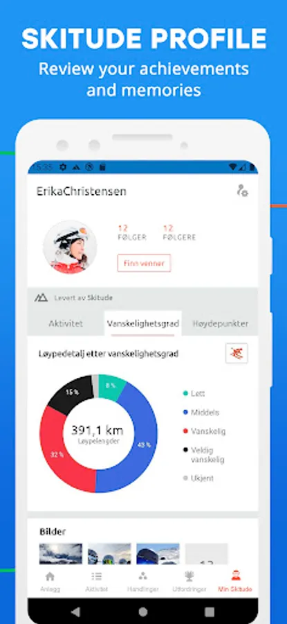 The App offers a range of features designed to optimize your experience before, during and after your trip. It’s very simple, plan your getaway and get real time updates on slope conditions. Set up your Skitude profile and track your activities on the slopes to get detailed stats about all your activities. And that’s not all, take part in challenges competing with the whole community, to be in with a chance of winning incredible prizes.