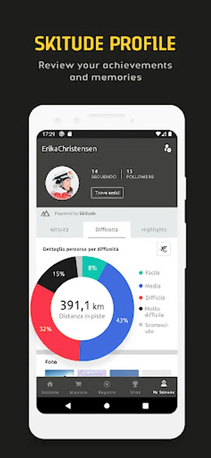 The App offers a range of features designed to optimize your experience before, during and after your trip. It’s very simple, plan your getaway and get real time updates on slope conditions. Set up your Skitude profile and track your activities on the slopes to get detailed stats about all your activities. And that’s not all, take part in challenges competing with the whole community, to be in with a chance of winning incredible prizes.