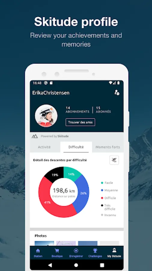 The App offers a range of features designed to optimize your experience before, during and after your trip. It’s very simple, plan your getaway and get real time updates on slope conditions. Set up your Skitude profile and track your activities on the slopes to get detailed stats about all your activities. And that’s not all, take part in challenges competing with the whole community, to be in with a chance of winning incredible prizes.