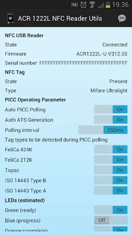 Utility for the ACR 1222L USB NFC Reader. Reads and/or sets various reader settings:
