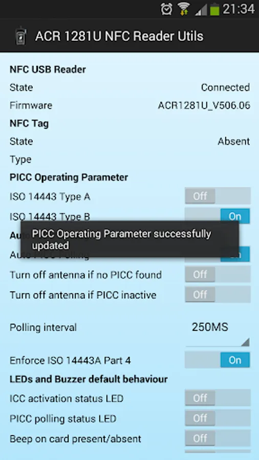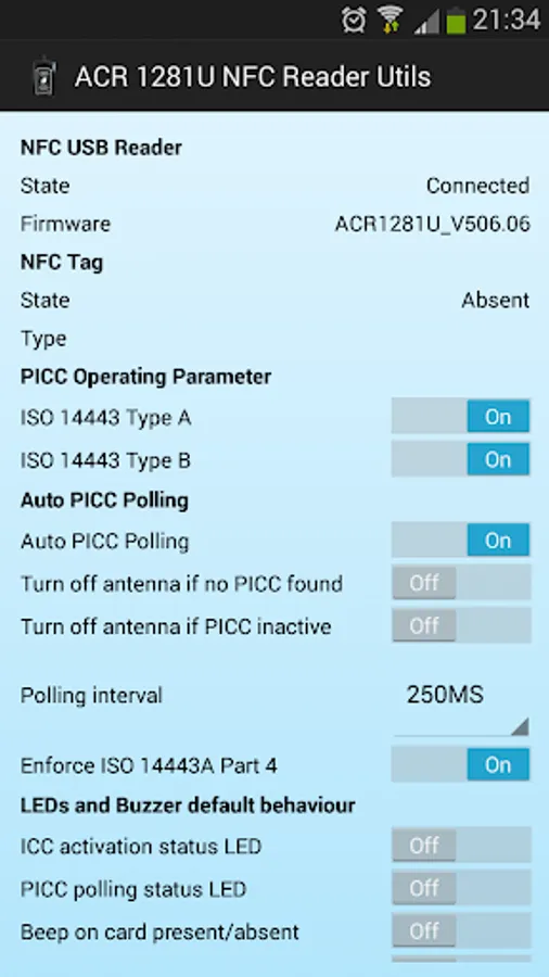Utility app for the ACR 1281 NFC Reader. Reads and/or sets various reader settings: