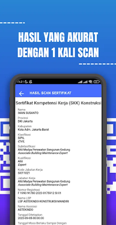 Instant QR Code scanning for SKK Konstruksi Certificate validation.