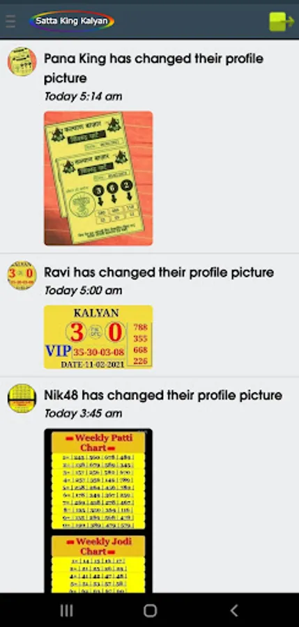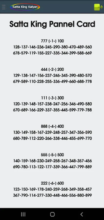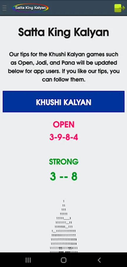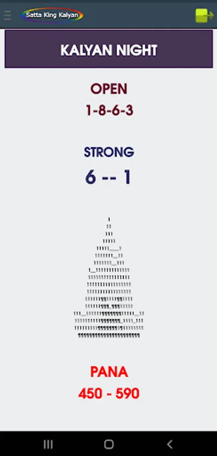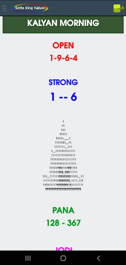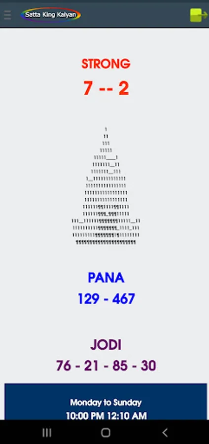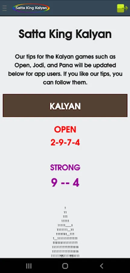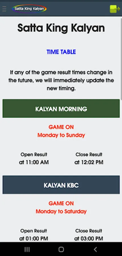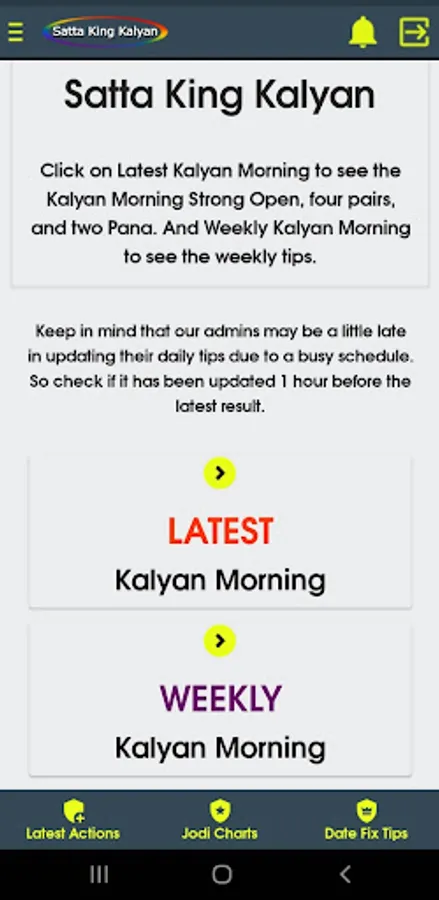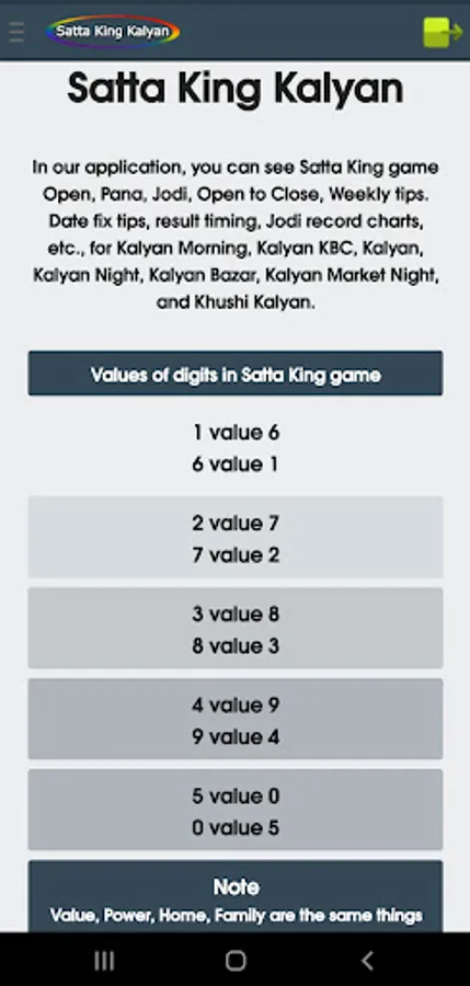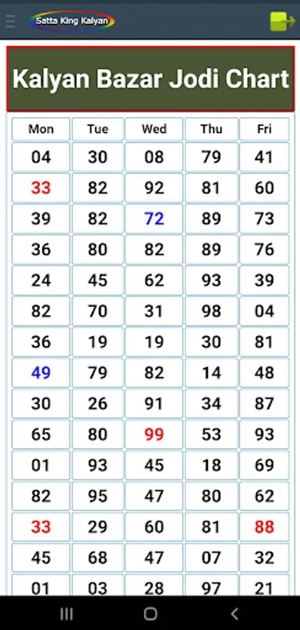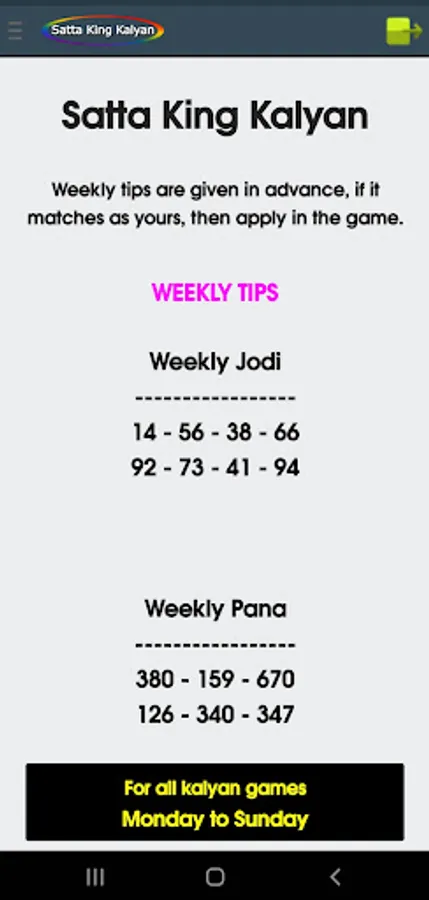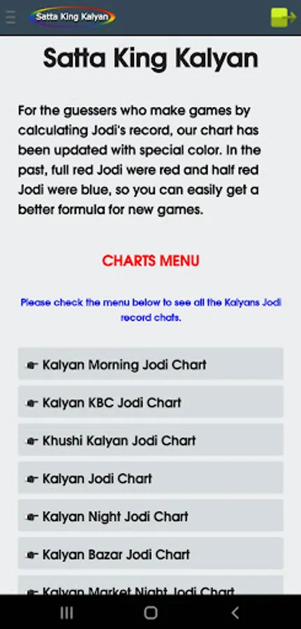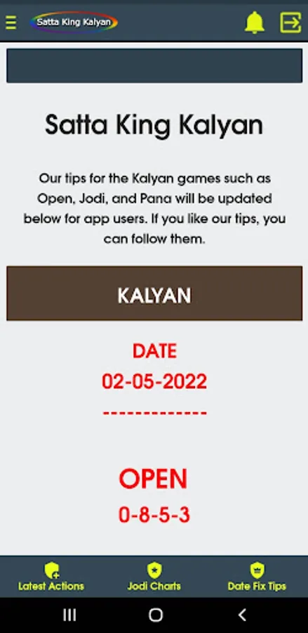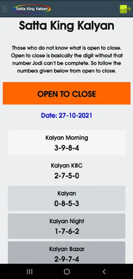 In our application, you can see Satta King game Open, Pana, Jodi, Open to Close, Weekly tips. Date fix tips, result timing, Jodi record charts, etc., for Kalyan Morning, Kalyan KBC, Kalyan, Kalyan Night, Kalyan Bazar, Kalyan Market Night, and Khushi Kalyan.