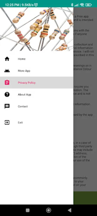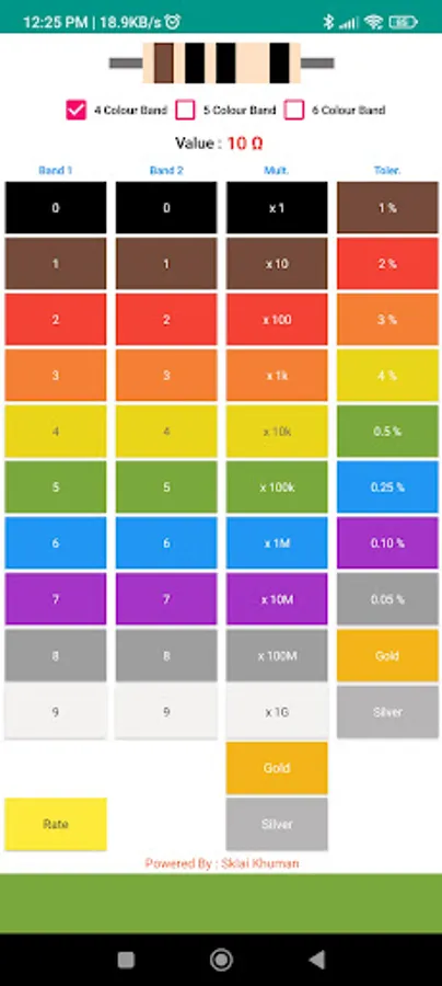 Resistance Colour Code is an app that can be used to calculate the resistance from the given or marked colour code of a resistance. This app can be used up to 6 colour band resistance.