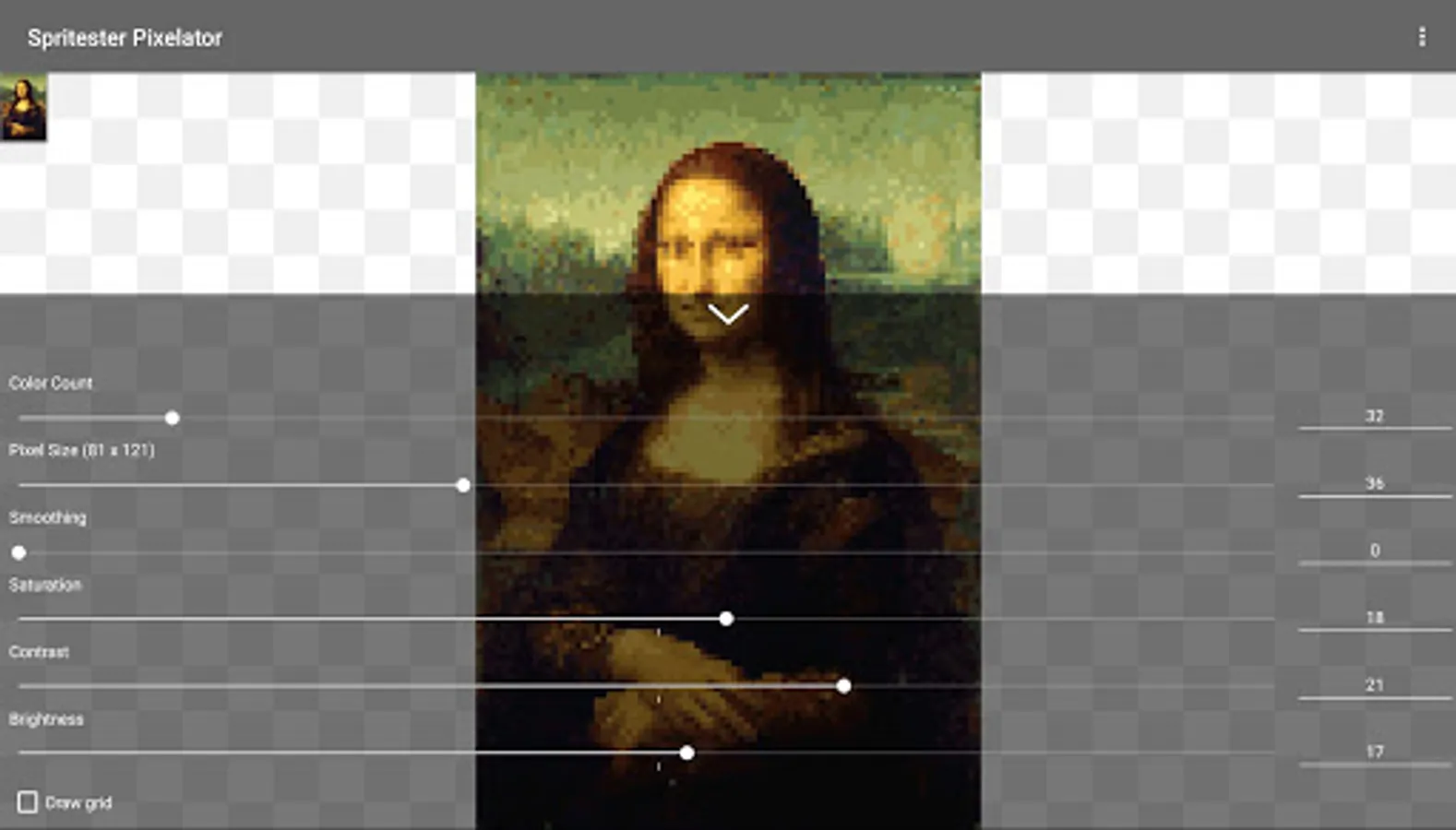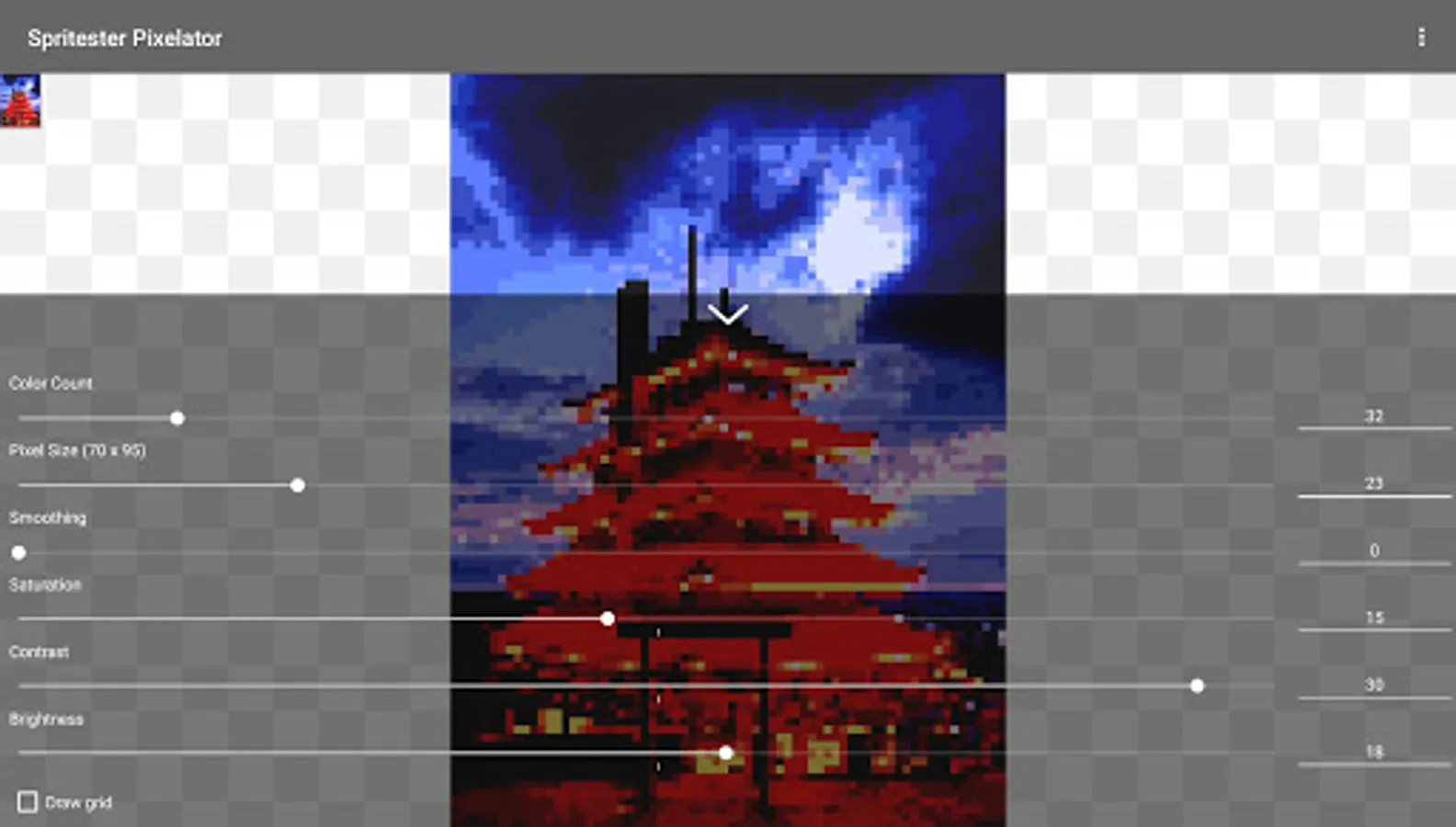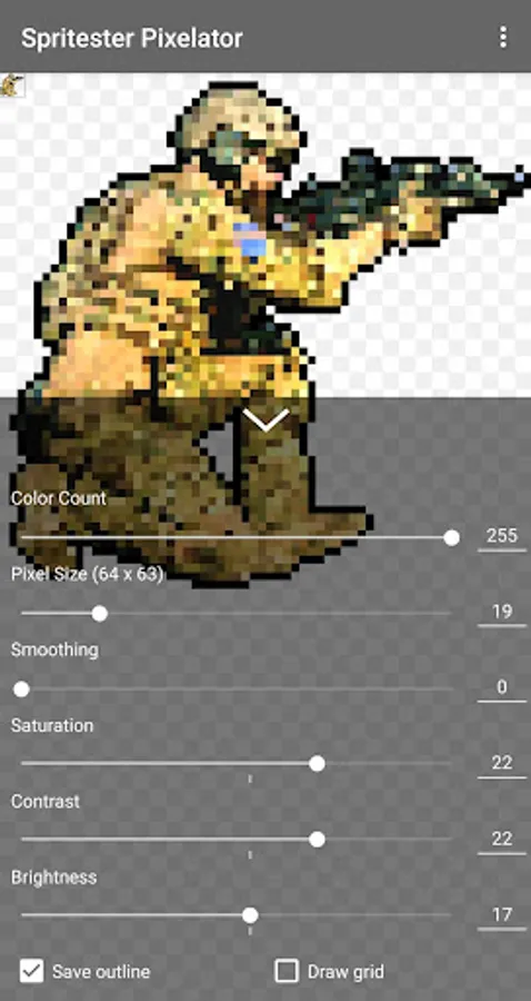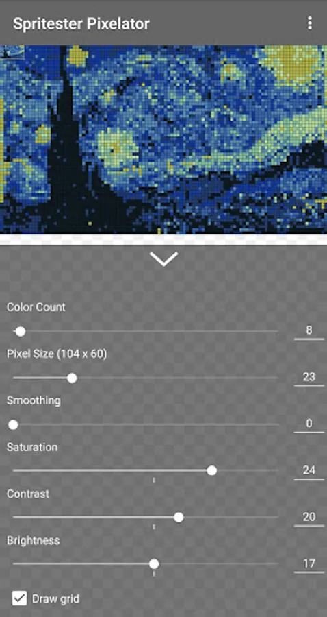 Spritester maintains and saves the state of your sprite at all times. No loss of work or data when you leave the app! You'll love this pixelator!