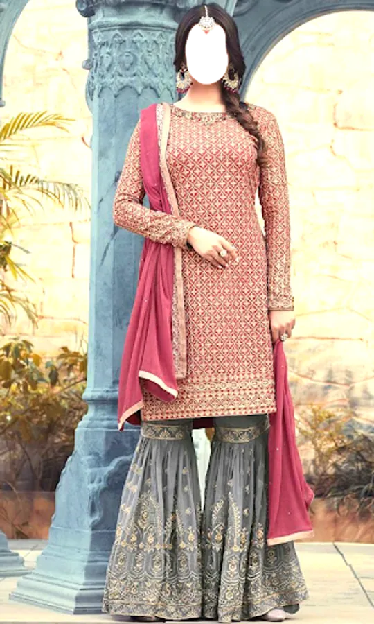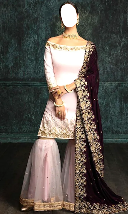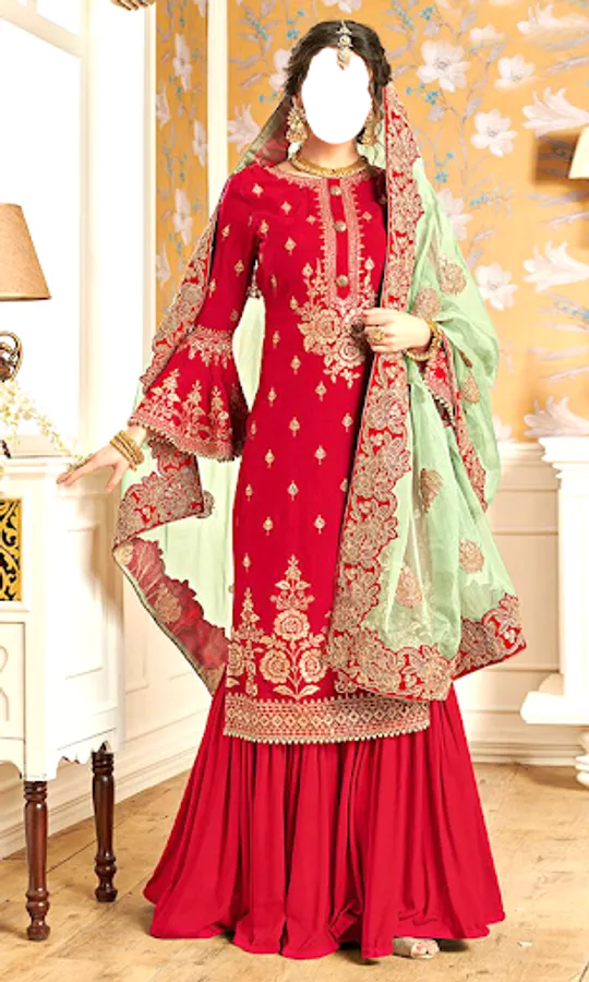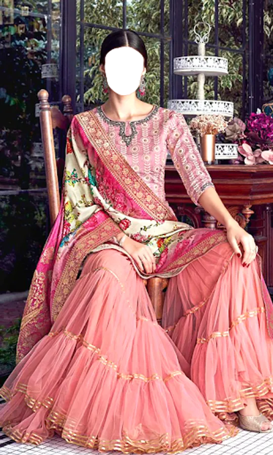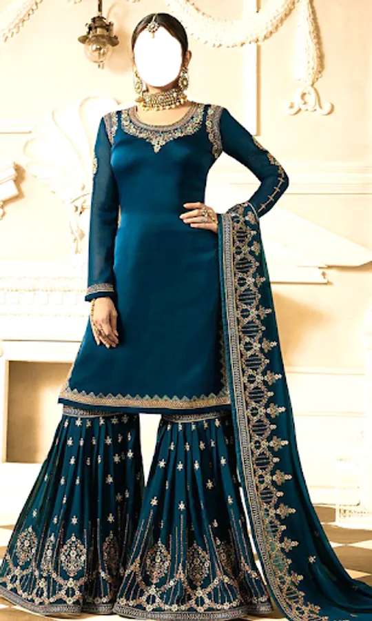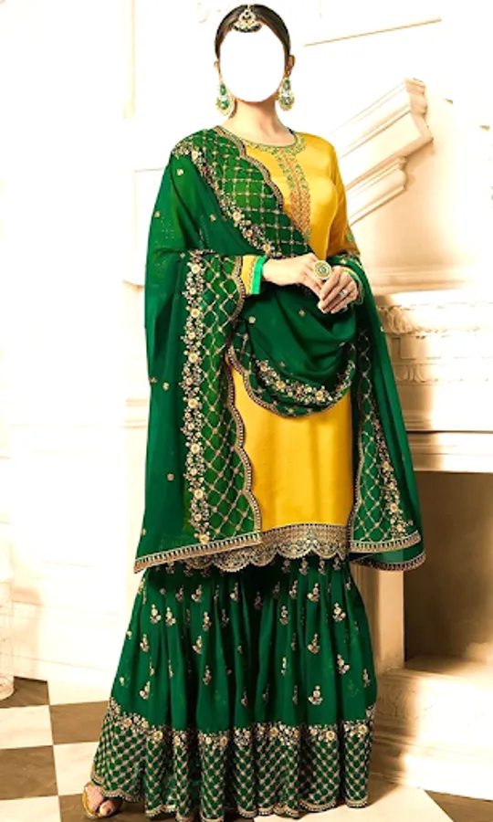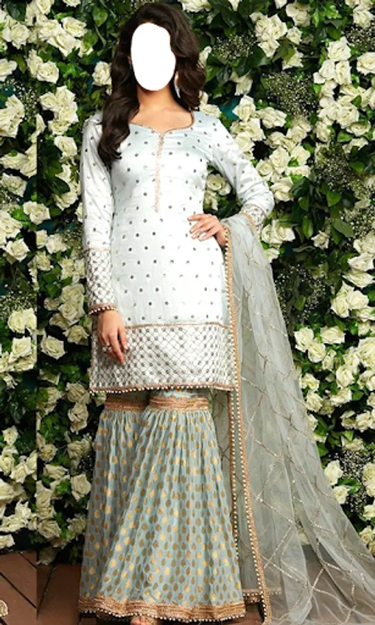 the differences between Sharara, Gharara, Dhaka pajamas and farshi pajamas are Gharara is similar to sharara but it has two legs, loose pants, in other words, pallazo.we have created this app to check your look in these different designer sharara dresses. All you need is to download this app for free and choose your straight looking pics and fit in your selected dresses.