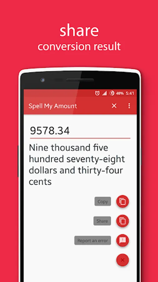 You can copy the result of the conversion to the clipboard or share it by SMS, Bluetooth, Email, Facebook, Twitter, WhatsApp ...