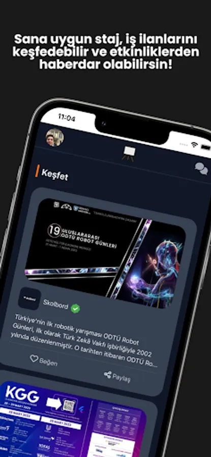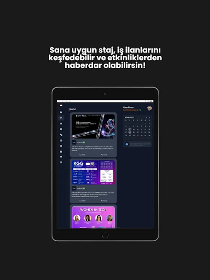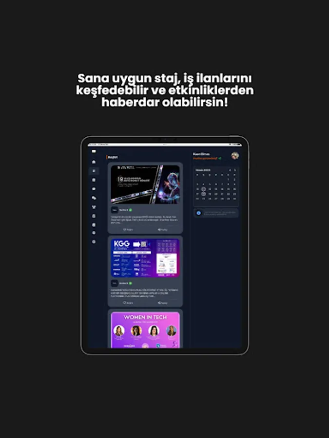 Follow the internship, scholarship and job postings on the main page with the content offered only for you, so that you can access the opportunities before anyone else, and you will reach the feedback and content about your day, week and future plan with the interface that will assist you in your university education life.