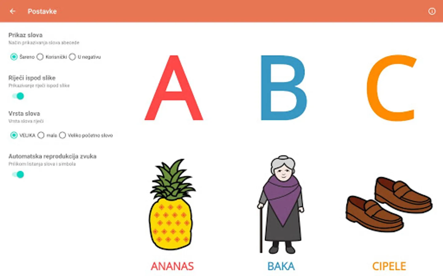 The application helps children to learn visual symbols and new phonological forms. Such paired visual and auditory symbols in this group of children encourage, maintain and improve early literacy skills necessary for reading and writing. The application contains a basic set of symbols, while each user can create their symbols using photos or images.