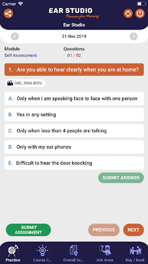 This is an app for hearing impaired patients. Using this app they can book assessment and treatment session. They can also practice all their rehabilitation lessons on the app. Below is a list of activities: