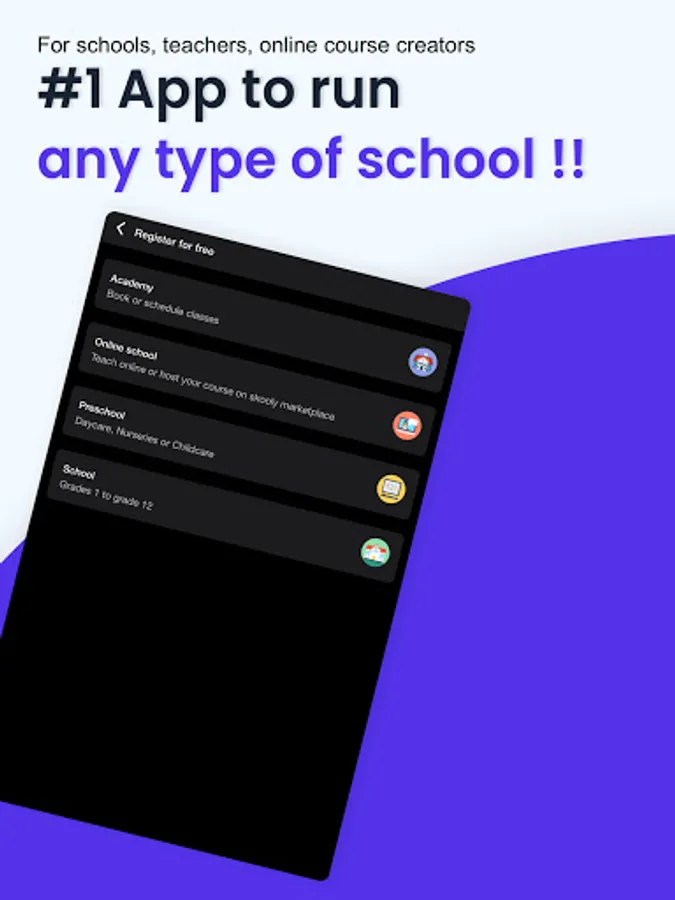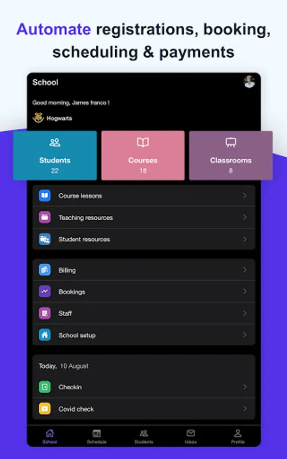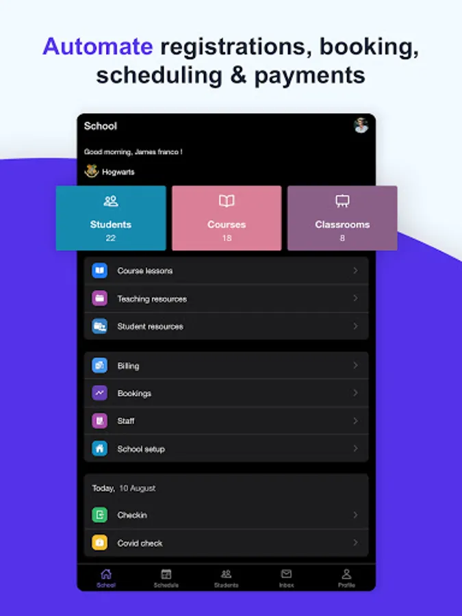 Automate your day to day admin work like student enrollment, invoicing , class scheduling, attendance, course management, daily reports, feedback reports. Run any type of school, academy, coaching or tutoring centre, preschools or daycares, sports, arts, online schools easily from one place. Easily adapt to hybrid mode, online or in person classes.