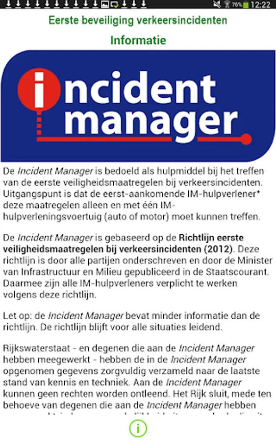 De Incident Manager bevat minder informatie dan de richtlijn waarop deze gebaseerd is: de Richtlijn eerste veiligheidsmaatregelen bij verkeersincidenten (2012). Deze richtlijn blijft voor alle situaties leidend.