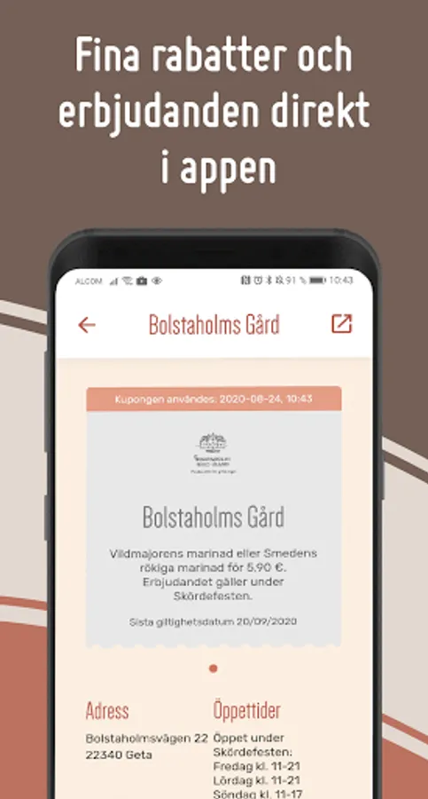 Having an account in the app costs 10 € (valid from 1 January to 31 December) and you get access to coupons and offers worth more than 150 €. By buying our app, you are helping to support the Åland countryside and contribute to the association Skördefestens Vänners long-term work with the popular events Skördefesten and Åland Grönskar.