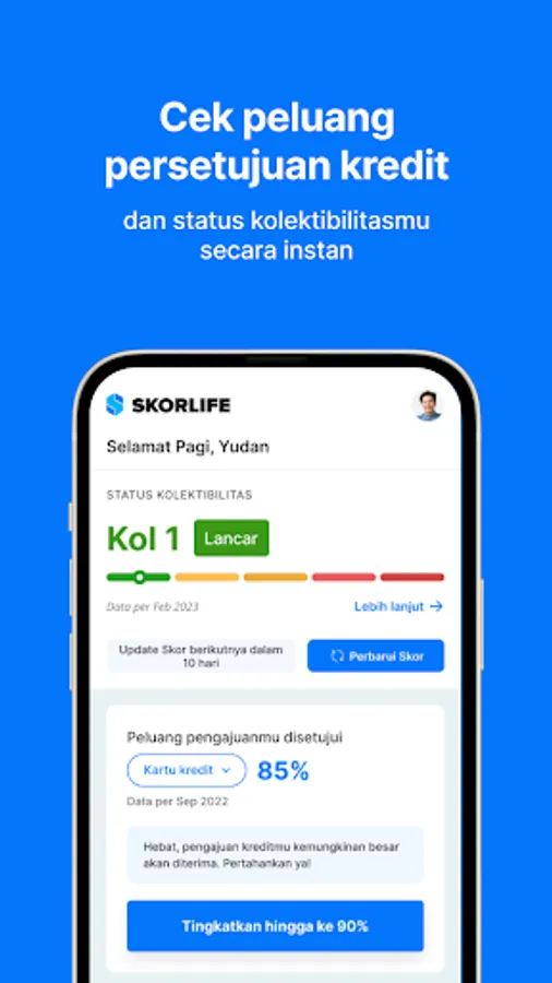 SkorLife adalah aplikasi manajemen kredit. Di sini, kamu bisa melihat peluang persetujuan kreditmu dan mulai membangun reputasi finansial yang kuat. Jalanmu jadi lebih cepat buat mengejar banyak mimpi!