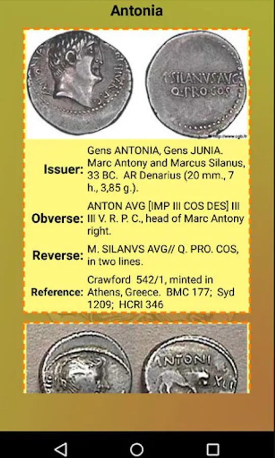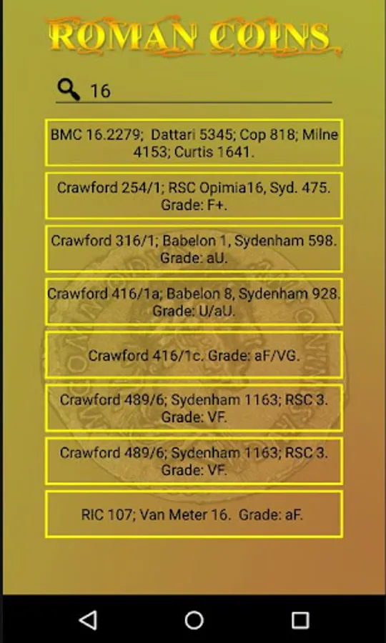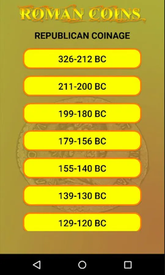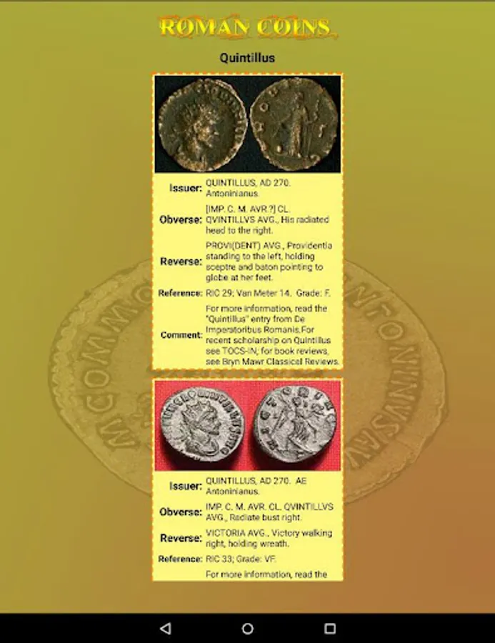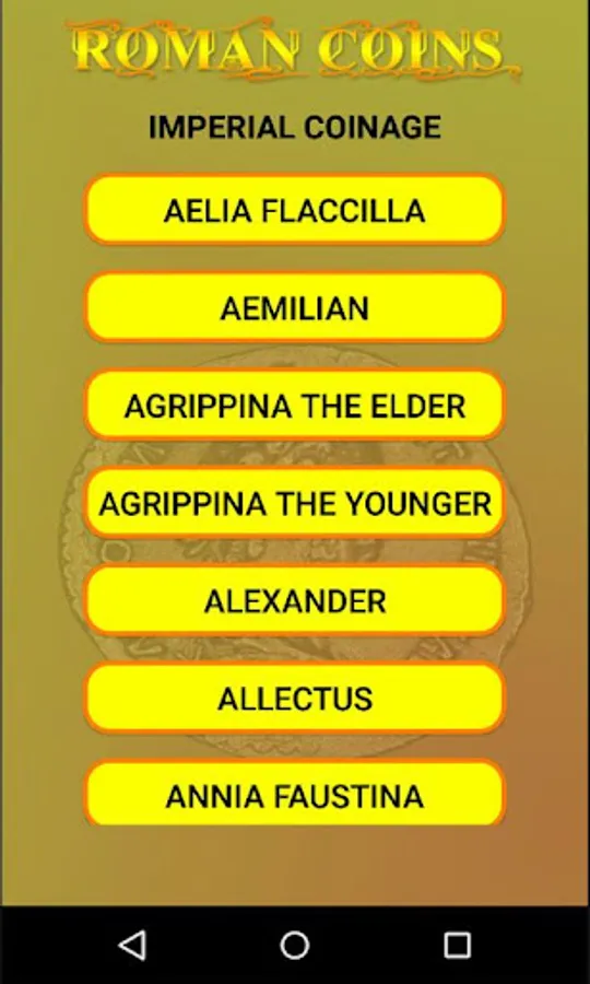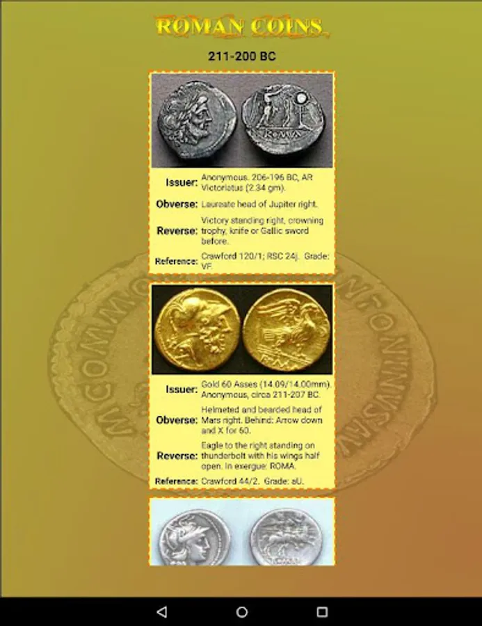 This app is dedicated to roman coinage, especially republican and imperial. Identify roman coins by metal, type of coin, emperor..