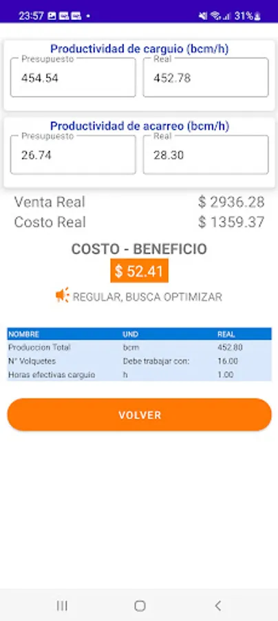 Mobile application that allows you to calculate the cost benefit in activities where loading and hauling equipment is used