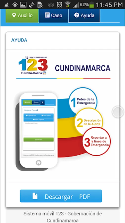 By registering with the system 123 Cundinamarca, you can report alerts through a Help button to the security agencies of the department. You can also report emergencies through a brief description of the incident and photographic attachments.
