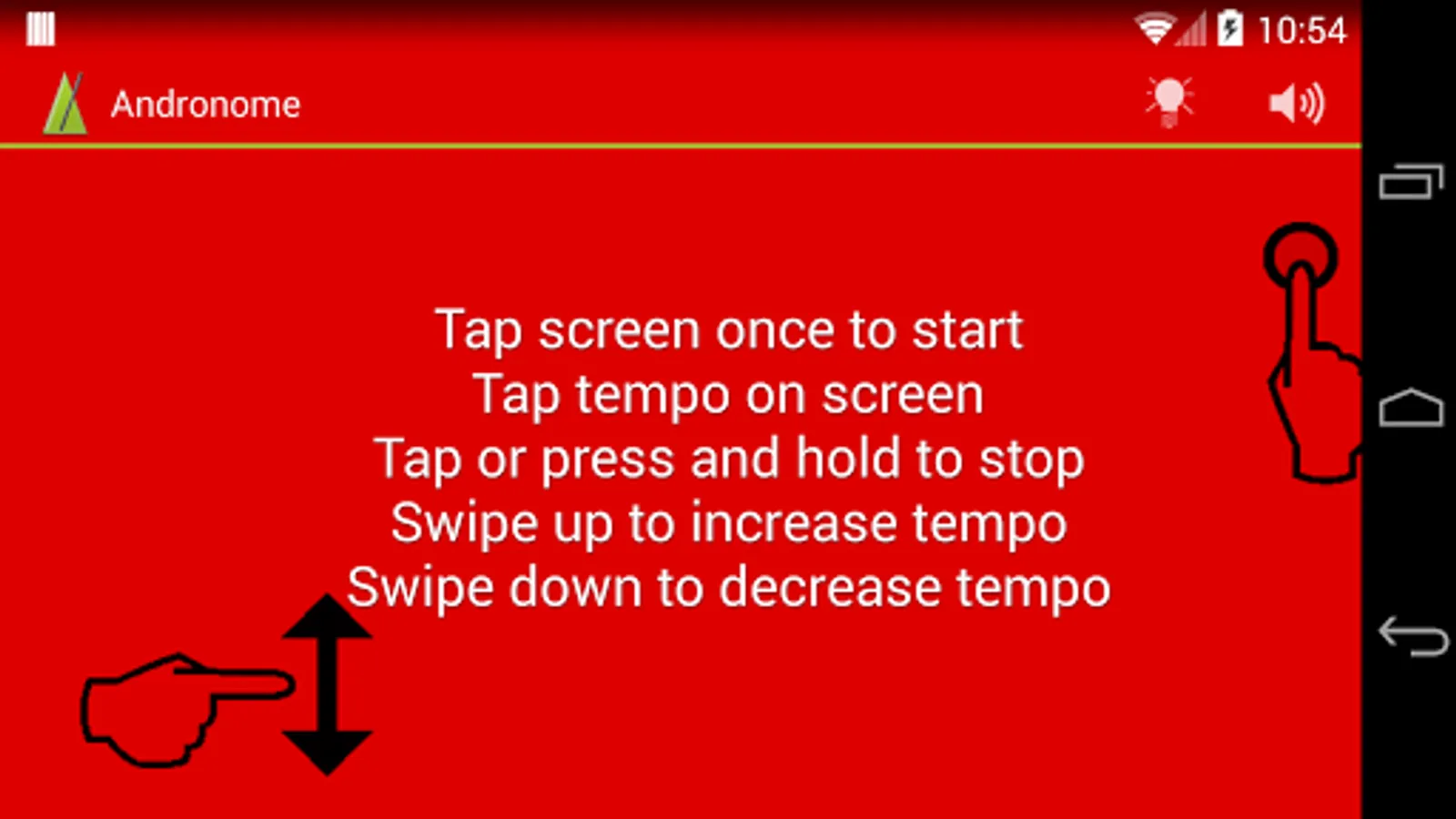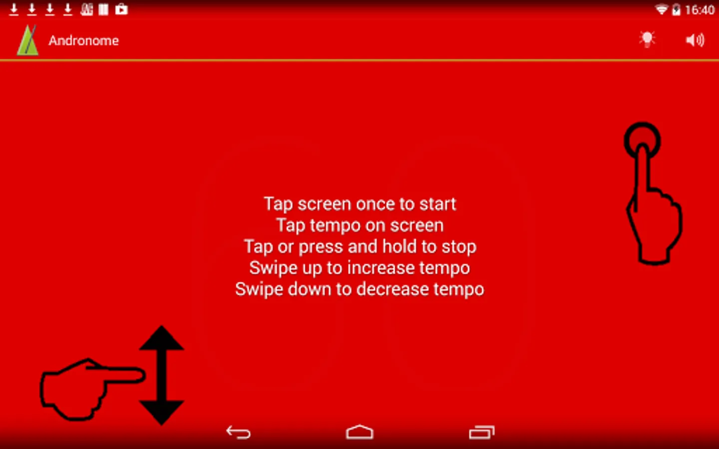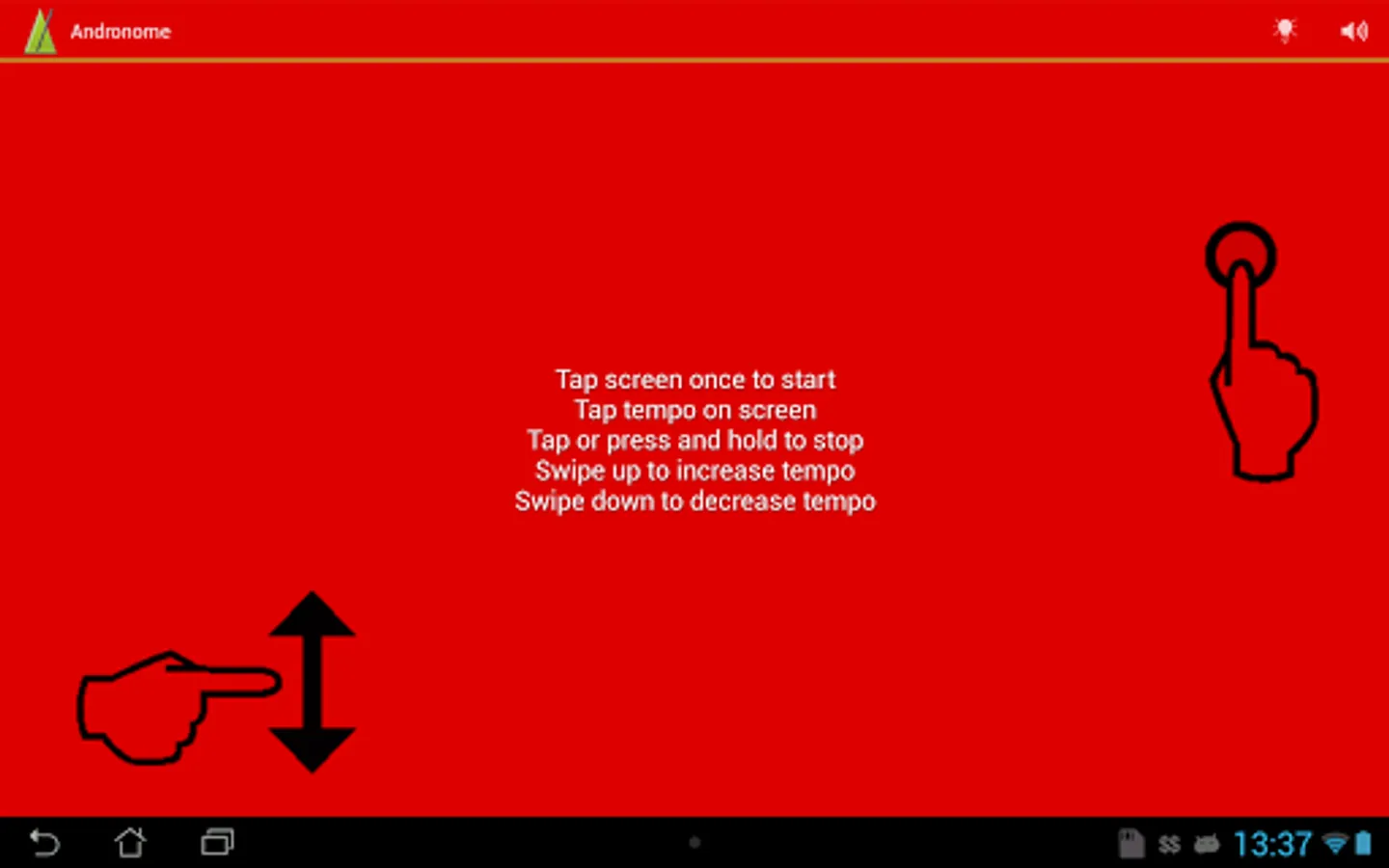 * Adjust the tempo by swiping the finger over the screen. Fling or swipe up to increase the BPM, down to decrease.