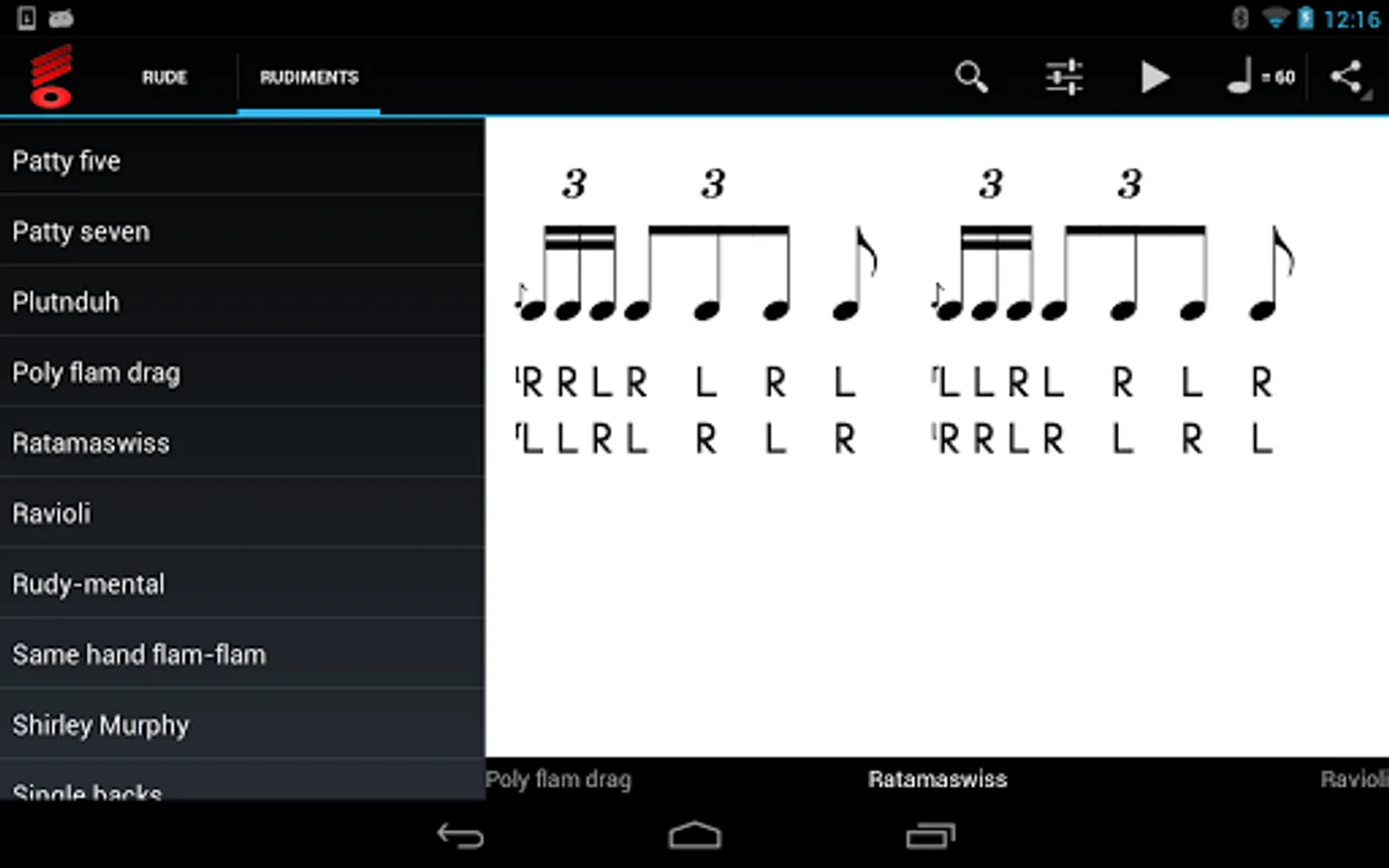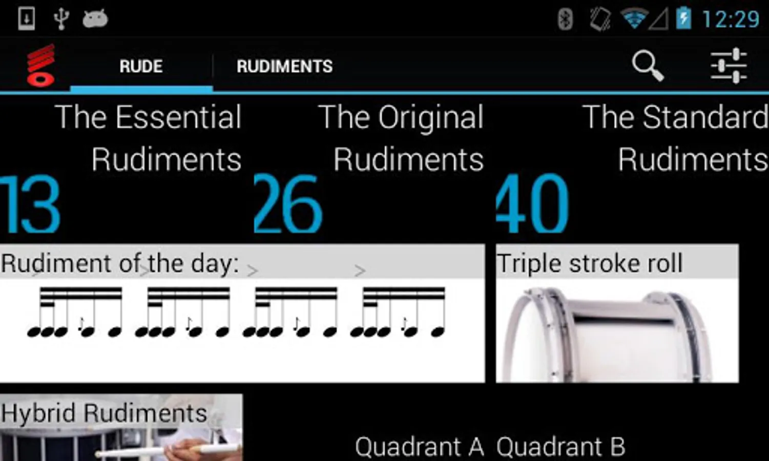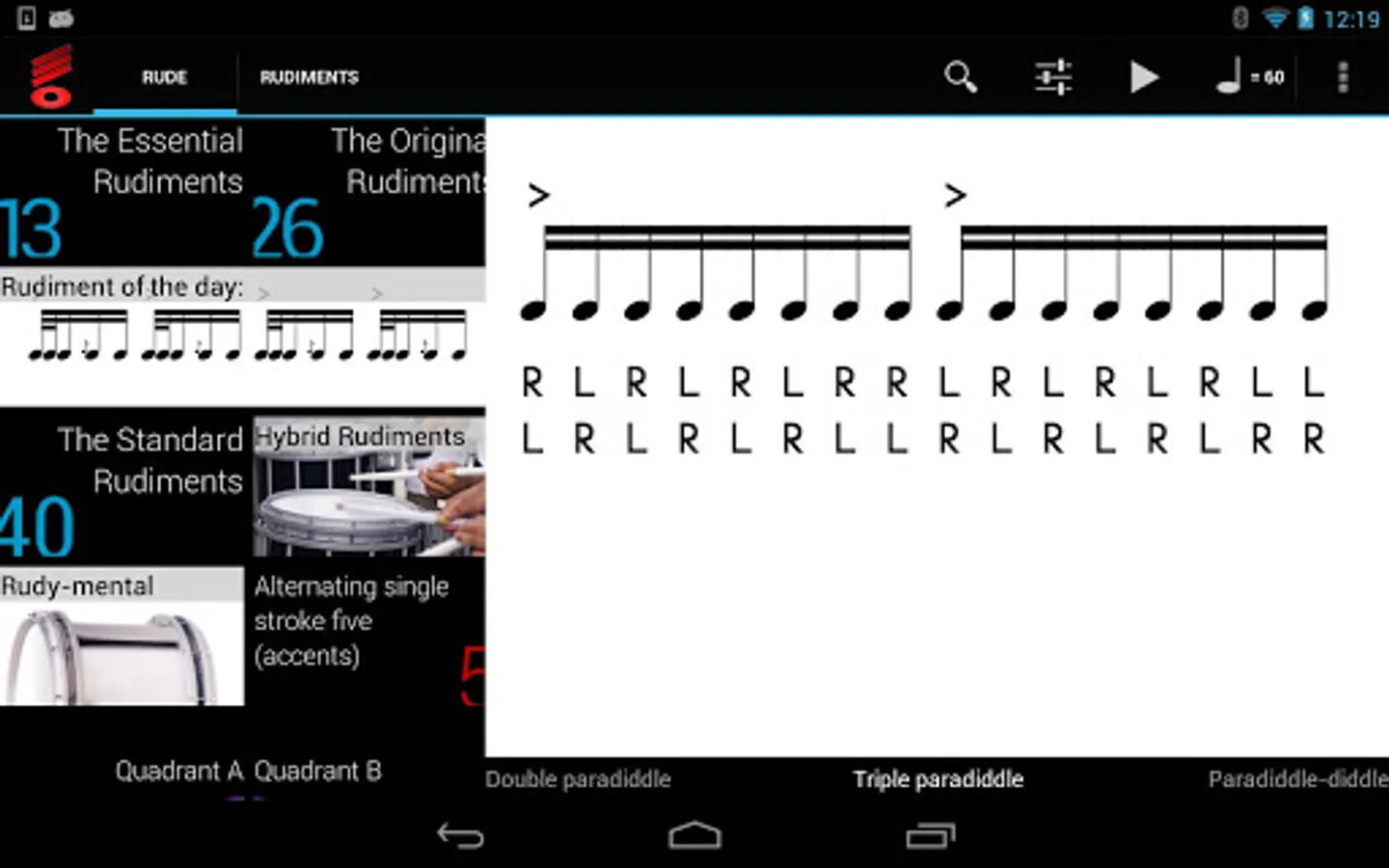 * Show and play all 40 official drum rudiments, with name and order according to PAS (Percussive Arts Society).