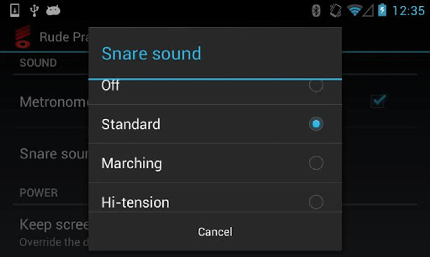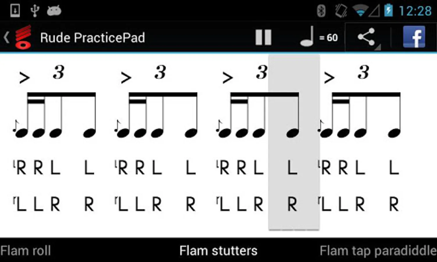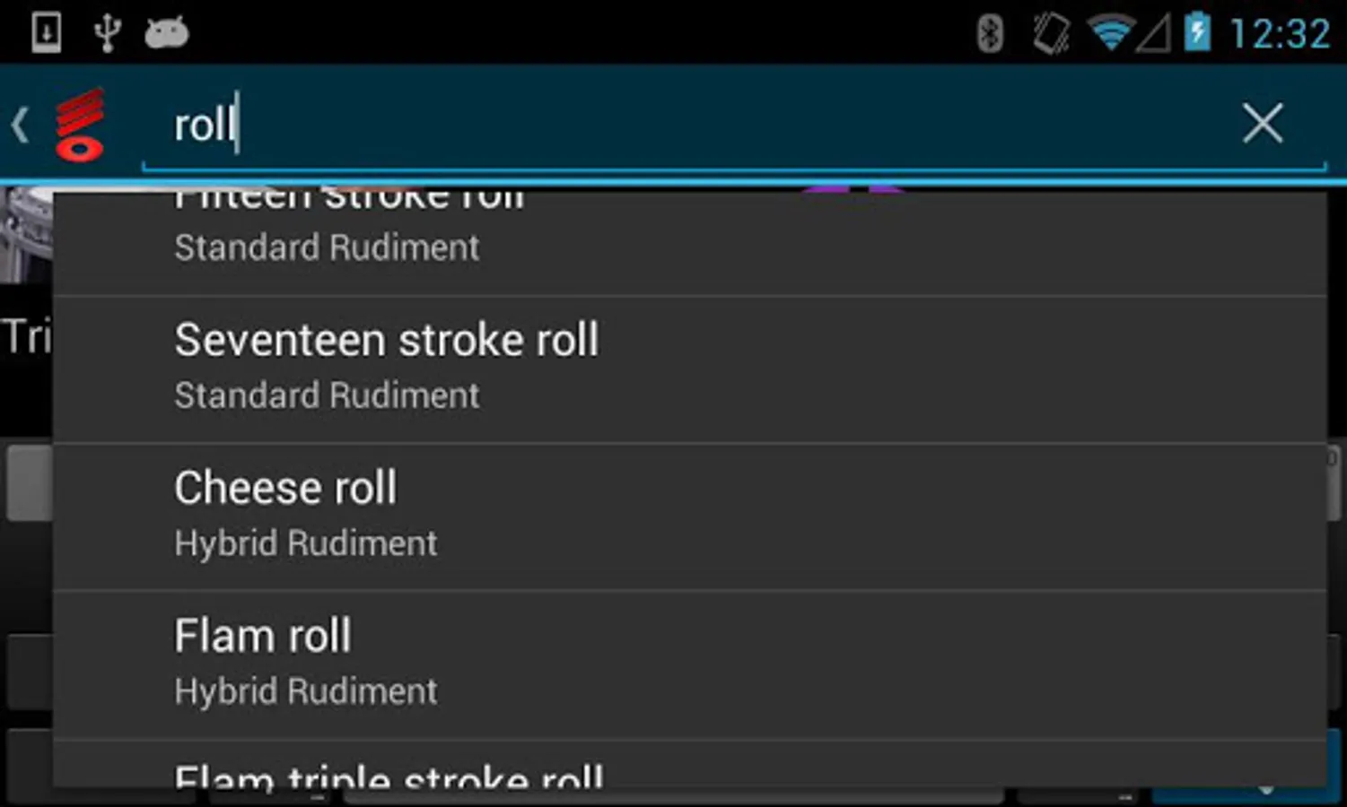 * Show and play all 40 official drum rudiments, with name and order according to PAS (Percussive Arts Society).