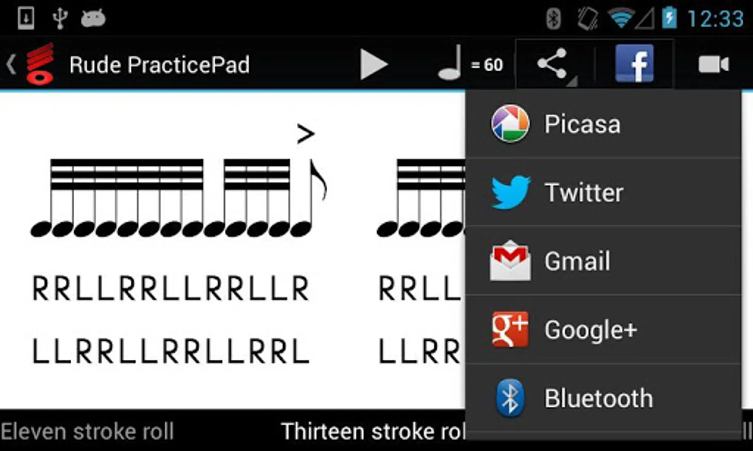 * Share rhythms via mail or Bluetooth. Post on Facebook. Tweet on Twitter.